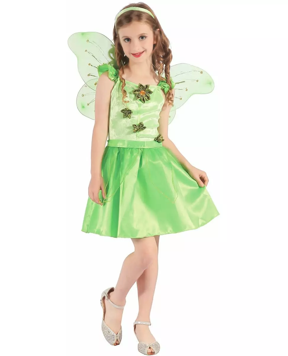 Forvandle deg til en fe med en vifting med tryllestaven din. Dette grønne fe-kostymet for jenter består av en kjole, et belte, et par vinger og et pannebånd (sko ikke inkludert). Overdelen av kjolen er grønn i et fløyelslignende stoff. Den er dekorert med khaki satengblomster. Underdelen av kjolen er lysegrønn i et satengstoff. Denne kjolen har tynne elastiske stropper. Et satengbelte er festet til livet. Den er dekorert med grønne slørblader foran. Pannebåndet har grønn fløyelslignende effekt. Fe-vingene er laget av grønt slør, med sølv- og gullpaljetter. De bæres med elastiske bånd. Dette fe-kostymet vil være perfekt til en bursdag eller karneval. Inkludert tilbehør: Kjole Vinger Belte Pannebånd Materiale: 100 % polyester Vedlikehold: Håndvask