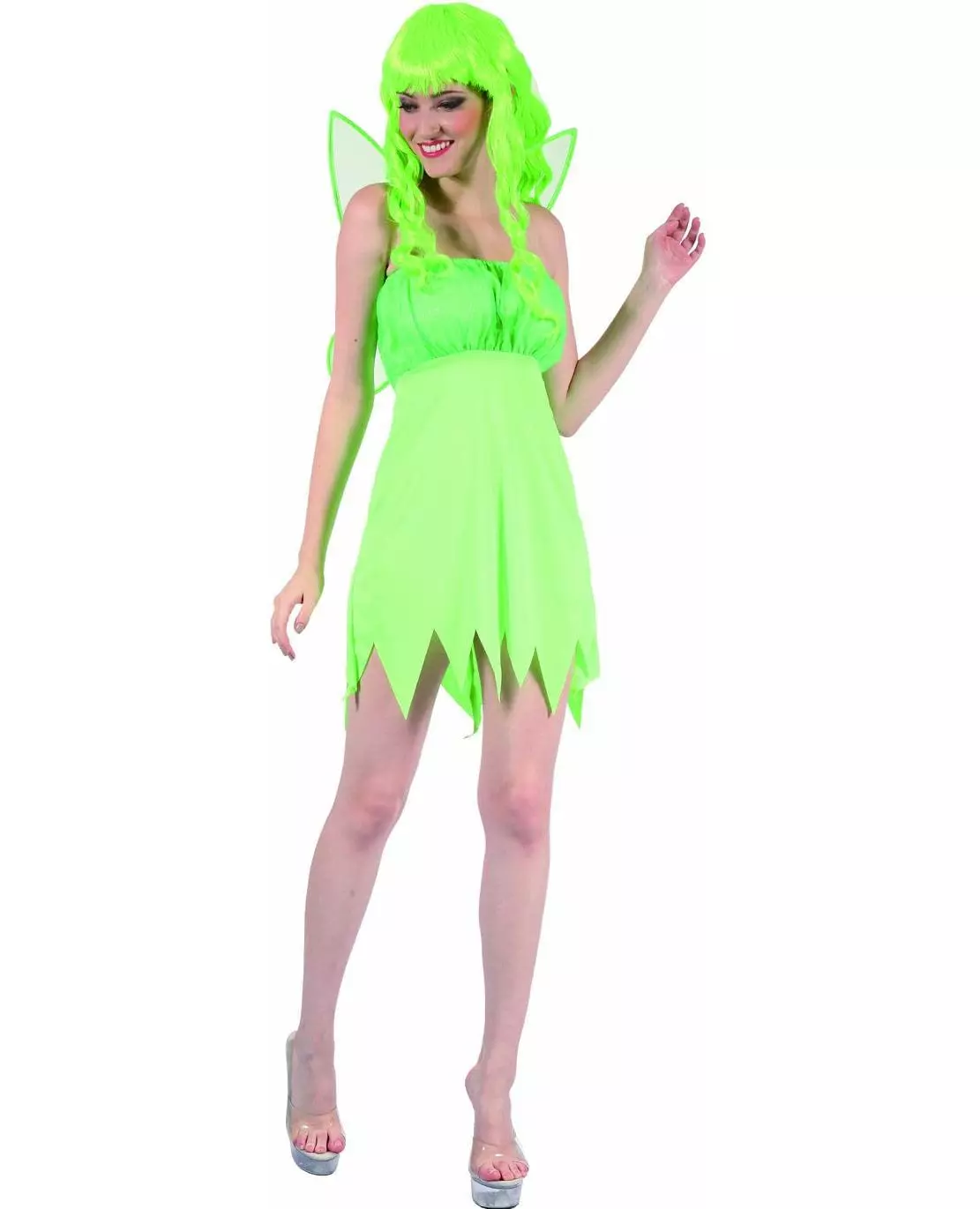 Med et sveip med tryllestaven din, forvandler du deg til en fe. Dette grønne fe-kostymet for voksne inkluderer en kjole og vinger (parykk ikke inkludert). Kjolen er neongrønn. Toppen er en bouffant-bustier. Underskjørtet er rett med en avsmalnende effekt takket være stoffet som er kuttet i spisser. Kjolen holdes på plass av gjennomsiktige stropper, justerbare, men ikke avtakbare. Et par vinger i samme grønne farge bæres på ryggen og festes som en ryggsekk med gjennomsiktige stropper som også er justerbare, men ikke avtakbare. Hvis du er invitert til en kveld med temaet natur eller magiske figurer, vil dette fe-kostymet la deg oppfylle ønsker. Inkludert tilbehør: Kjole Vinger Materiale: 100 % polyester Stell: Håndvask