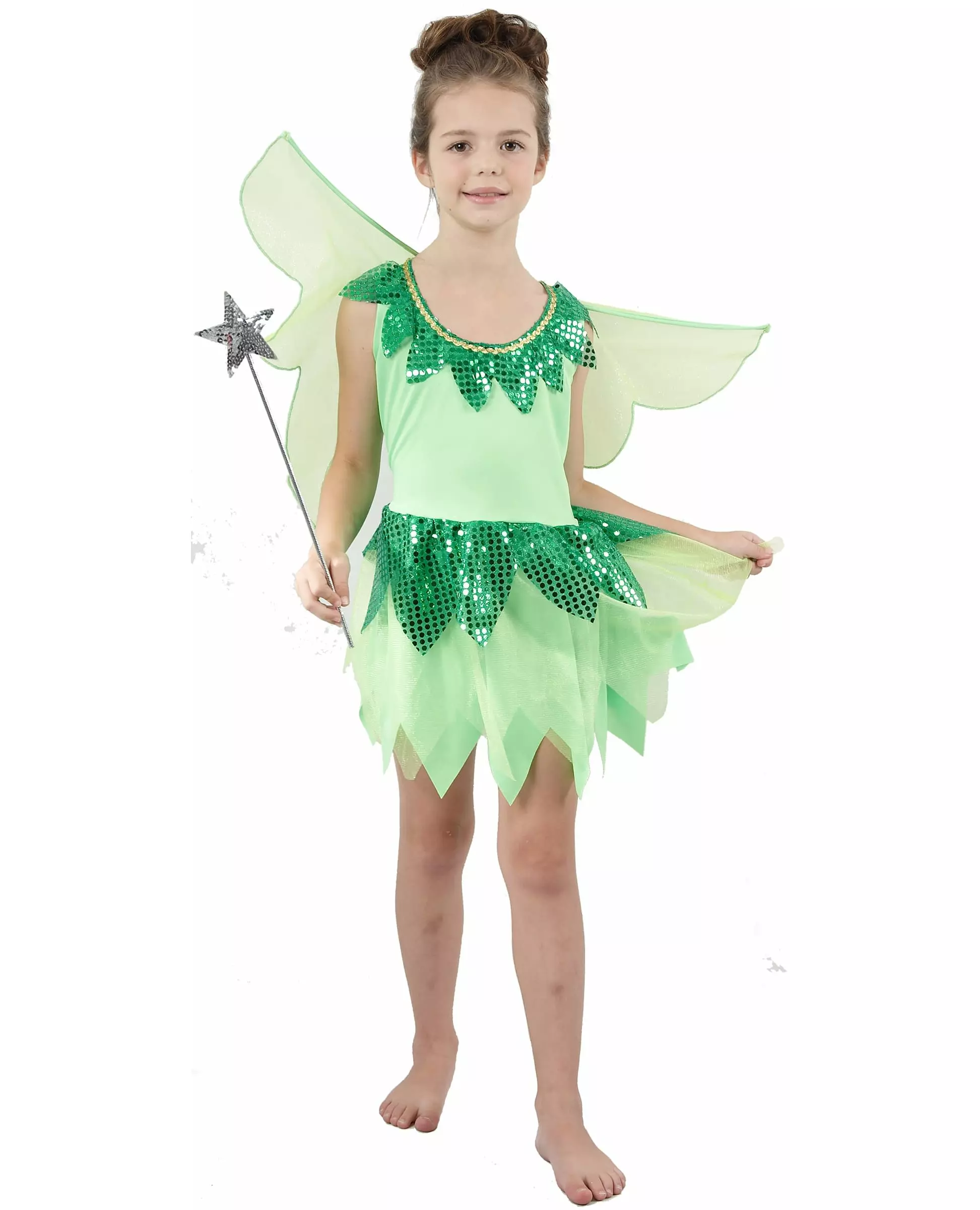 Med to veldig lette små vinger! Dette grønne fe-kostymet for jenter består av en kjole og et par vinger. Kjolen er laget av et veldig lysegrønt stoff, dekorert med en gullkant og grønt glitter ved halsen og midjen. Et gjennomsiktig slør med skinnende refleksjoner dekker bunnen av kjolen. Vingene er veldig lette og er festet på ryggen med borrelås. En metallstang på toppen lar deg orientere dem slik du ønsker (tryllestav ikke inkludert). Dette kostymet vil være perfekt for å gjøre barnet ditt til den peneste feen på karnevalsdagen eller til andre utkledningsarrangementer. Inkludert tilbehør: Kjolevinger Materiale: 100 % polyester Pleie: Håndvask