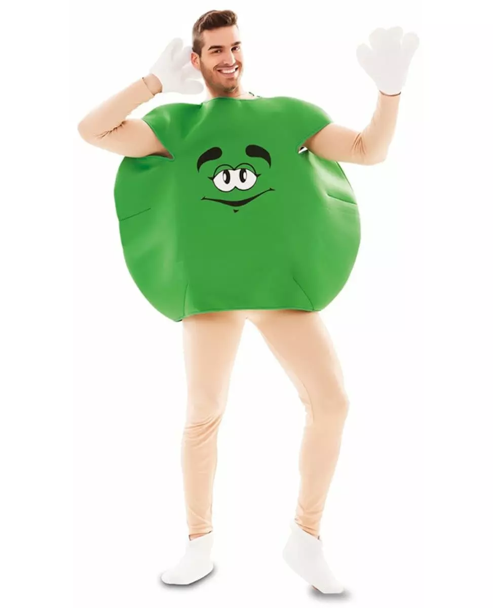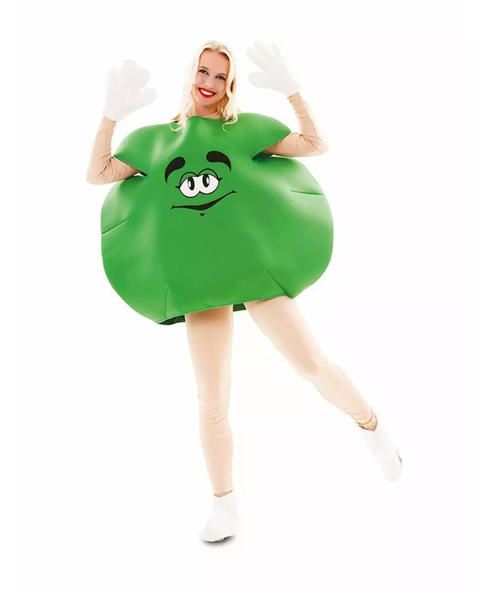 Leter du etter en godbit? Dette grønne godterikostymet for voksne består av en tunika, to hansker og to skotrekk (body ikke inkludert). Tunikaen er formet som en grønn ball. Denne ermeløse jumpsuiten har to armåpninger. Øyne, munn og øyenbryn er tegnet på forsiden av denne tunikaen. Stoffet er polstret med skum for å opprettholde ballformen. Hanskene og skotrekkene er hvite og fôret med skum for å gi dem mer volum samtidig som de beholder formen. Velg humor under en kostymefest med karaktertema! Inkludert tilbehør: Tunika, to hansker, to skotrekk. Materiale: Polyester. Vedlikehold: håndvask.