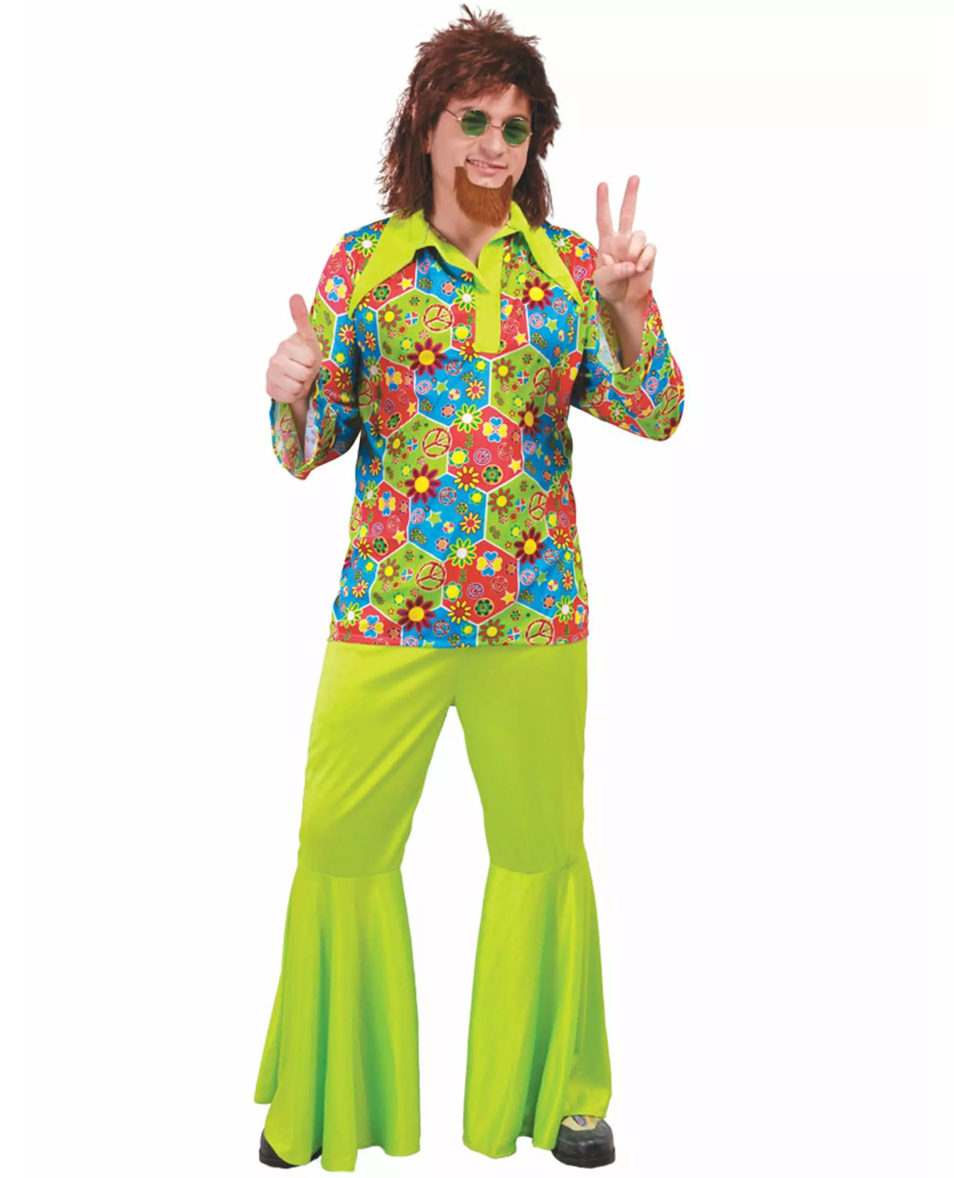 Veldig grønt! Dette hippiekostymet for menn består av en tunika og bukser (briller, parykk og geiteskjegg er ikke inkludert). Den langermede tunikaen er laget av et stoff med et flerfarget blomstertrykk, med symbolet «fred og kjærlighet». En bred rund hals gir antrekket et funky preg. De prangende grønne buksene med klokkeform fullfører kostymets hippie-utseende. Med dette kostymet vil du se ut som en ekte hippie, rett ut av 60- og 70-tallet, på neste utkledningsfest eller karneval. Inkludert tilbehør: Bukser Tunika Materiale: 100 % polyester Vedlikehold: Håndvask