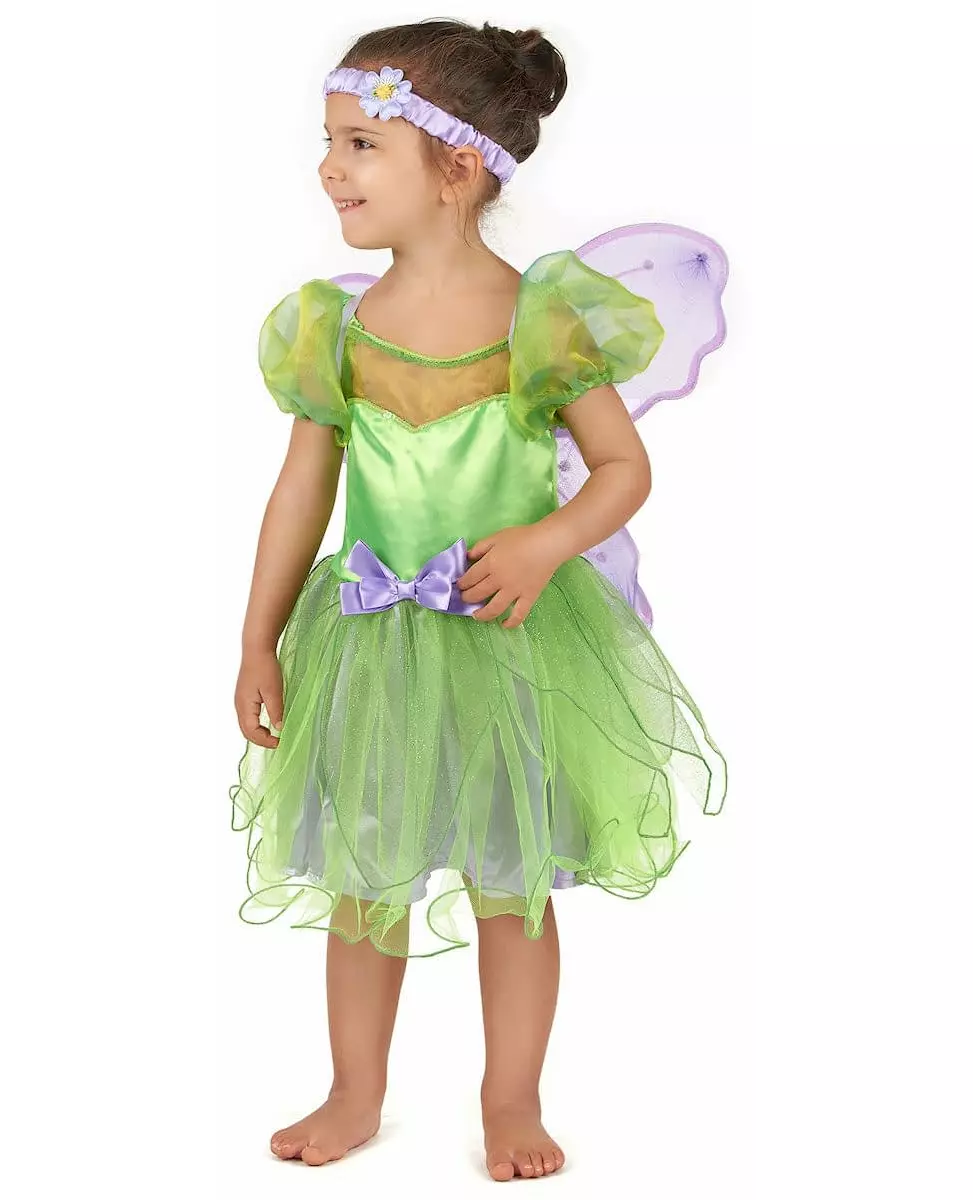 Forvandle deg til en liten fe med en vifting med tryllestaven din. Dette fe-kostymet for barn består av en kjole, et par vinger og et pannebånd. Kjolen er grønn i satengstoff. Halsutringningen er dekorert med en linje med skinnende lysegrønne paljetter. Over er det sydd et grønt tyllstoff. De elastiske ermene er korte og puffete. Nederdelen av kjolen er laget av tre lag med stoff: Det første, helt nederst, er laget av lilla satengstoff. På toppen gir en andre del av grønn tyll volum til kjolen. Til slutt er den tredje delen også laget av tyll med paljetter. Pannebåndet er elastisk. En syntetisk blomst vil pryde dette pannebåndet. Vingene har en stiv ramme. Paljetter og strass pynter dette elementet av kostymet. Vingene vil bli festet til ryggen med stropper. Som en ryggsekk vil de ikke hindre barnets bevegelser. Vingene måler omtrent 36 cm høye og 44 cm brede. Dette svært komplette fe-kostymet vil glede datteren din. Hun vil være den søteste til karneval eller til en bursdagsfest. Inkludert tilbehør: Kjolevinger Pannebånd Materiale: 100 % polyester Vedlikehold: Håndvask