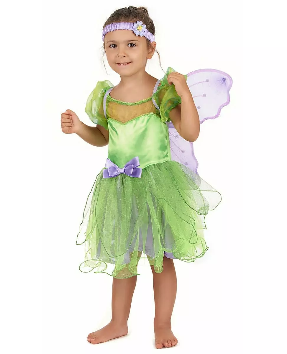 Forvandle deg til en liten fe med en vifting med tryllestaven din. Dette fe-kostymet for barn består av en kjole, et par vinger og et pannebånd. Kjolen er grønn i satengstoff. Halsutringningen er dekorert med en linje med skinnende lysegrønne paljetter. Over er det sydd et grønt tyllstoff. De elastiske ermene er korte og puffete. Nederdelen av kjolen er laget av tre lag med stoff: Det første, helt nederst, er laget av lilla satengstoff. På toppen gir en andre del av grønn tyll volum til kjolen. Til slutt er den tredje delen også laget av tyll med paljetter. Pannebåndet er elastisk. En syntetisk blomst vil pryde dette pannebåndet. Vingene har en stiv ramme. Paljetter og strass pynter dette elementet av kostymet. Vingene vil bli festet til ryggen med stropper. Som en ryggsekk vil de ikke hindre barnets bevegelser. Vingene måler omtrent 36 cm høye og 44 cm brede. Dette svært komplette fe-kostymet vil glede datteren din. Hun vil være den søteste til karneval eller til en bursdagsfest. Inkludert tilbehør: Kjolevinger Pannebånd Materiale: 100 % polyester Vedlikehold: Håndvask