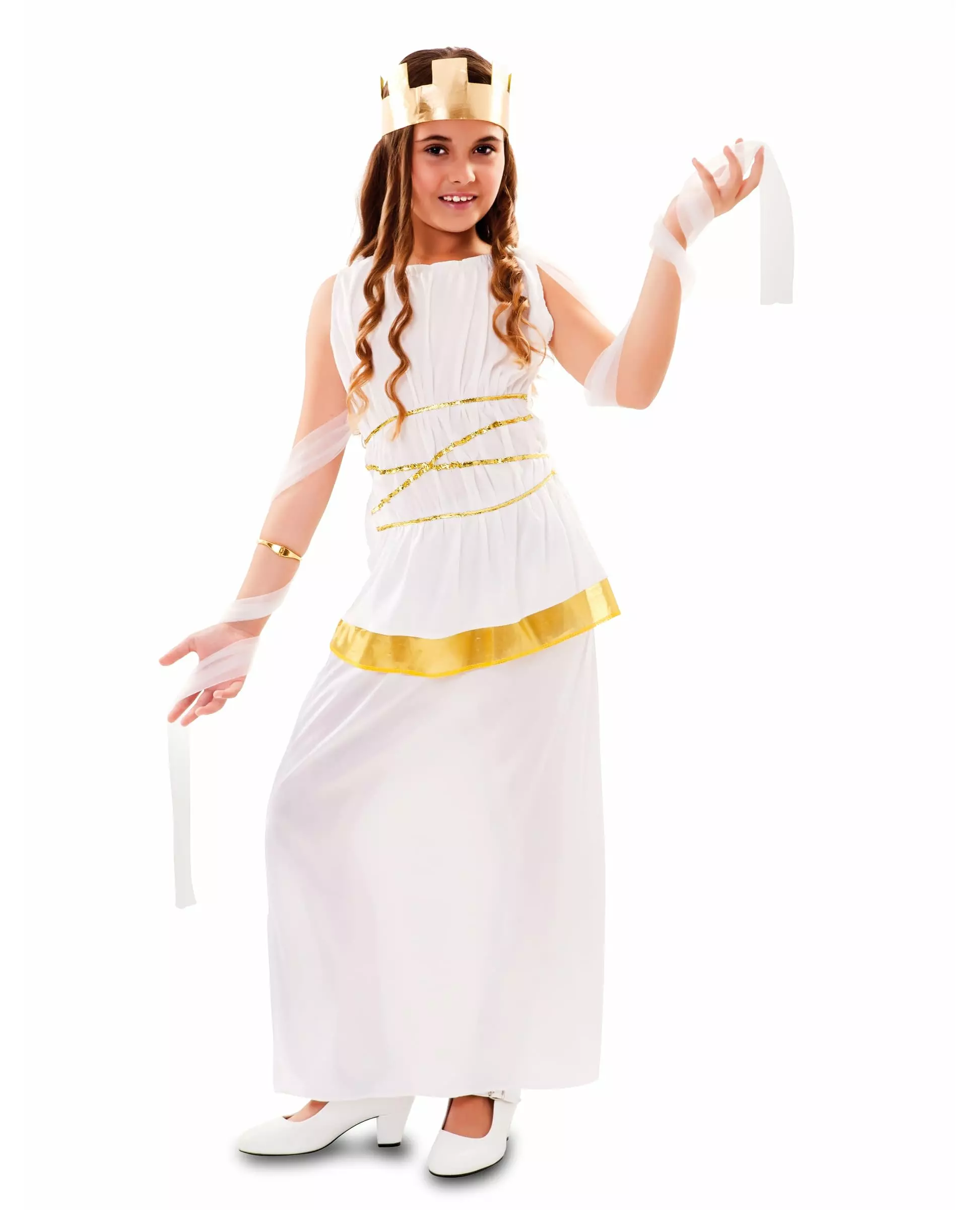 Gullfinish! Dette greske gudinnekostymet består av en t-skjorte, et skjørt og en krone. Denne lange t-skjorten er hvit med slør på ermene og et gult bånd nederst på t-skjorten. Skjørtet er langt og hvitt. En gyllen krone med strikk vil fullføre antrekket ditt. Dette kostymet vil være perfekt for karneval eller et utkledningsarrangement. Inkludert tilbehør: t-skjorte, skjørt, krone Materiale: 100 % polyester Vedlikehold: Håndvaskbar