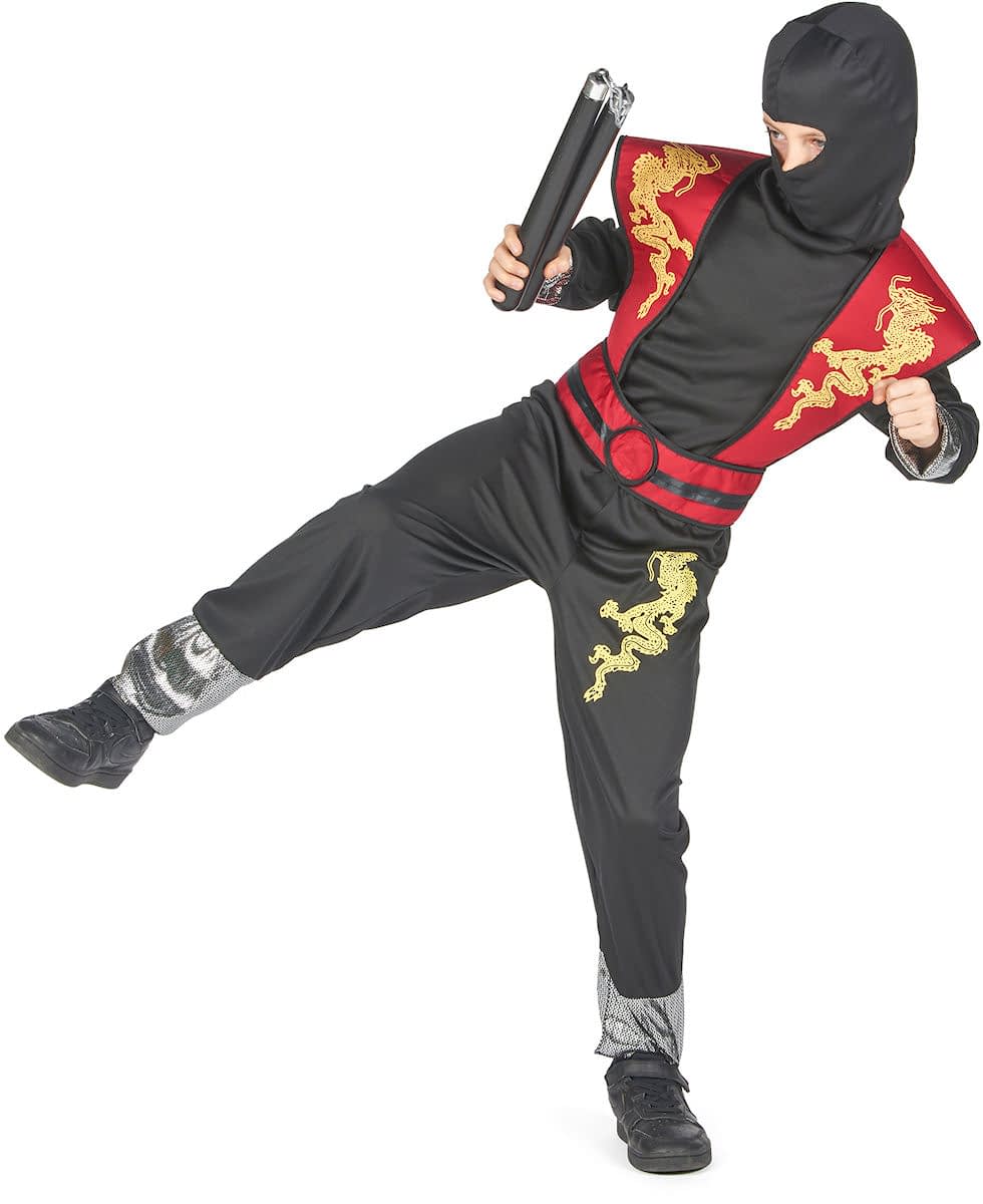 Bli en formidabel ninja Dette ninja-kostymet for gutter består av en jumpsuit, en hette og en brystbeskytter (nunchaku og sko er ikke inkludert). Den svarte jumpsuiten har et gult trykk som forestiller en drage på venstre ben. Nederdelen av ermene og bena er trykket med falske sølvpaljetter som gir et skinnende preg på helheten. Jumpsuiten har borrelås øverst på ryggen for å gjøre den enklere å ta på. Hetten er svart. Den er åpen i øyehøyde, slik at du kan se uten å bli forstyrret. Til slutt vil en rød brystbeskytter sette prikken over i-en på dette ninja-kostymet. Dette er trykket med gule drager på begge sider. Beltet som er sydd til brystplaten festes til midjen med borrelås. Dette komplette kostymet vil være perfekt for å bli en ninjakriger til karneval. Inkludert tilbehør: Jumpsuit Hette Brystplate Materiale: 100 % polyester Vedlikehold: Håndvask
