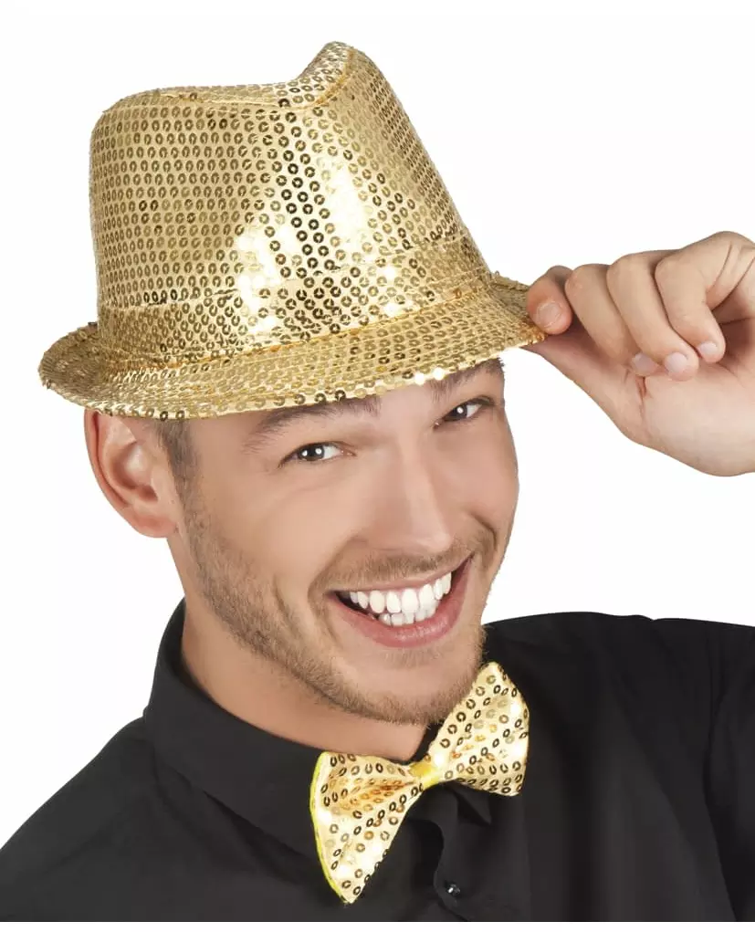 Gi antrekket ditt et snev av eleganse med denne gullfargede sløyfen. Denne voksensløyfen er laget av gullfarget stoff. Den er dekorert med gullfargede paljetter. Den måler omtrent 14 x 8 cm og holdes rundt halsen med en strikk. Denne gullfargede sløyfen vil være perfekt for å fullføre et kabaret-tema kostyme med klasse. Inkludert tilbehør: Sløyfe Materiale: 95 % polyester, 5 % PVC