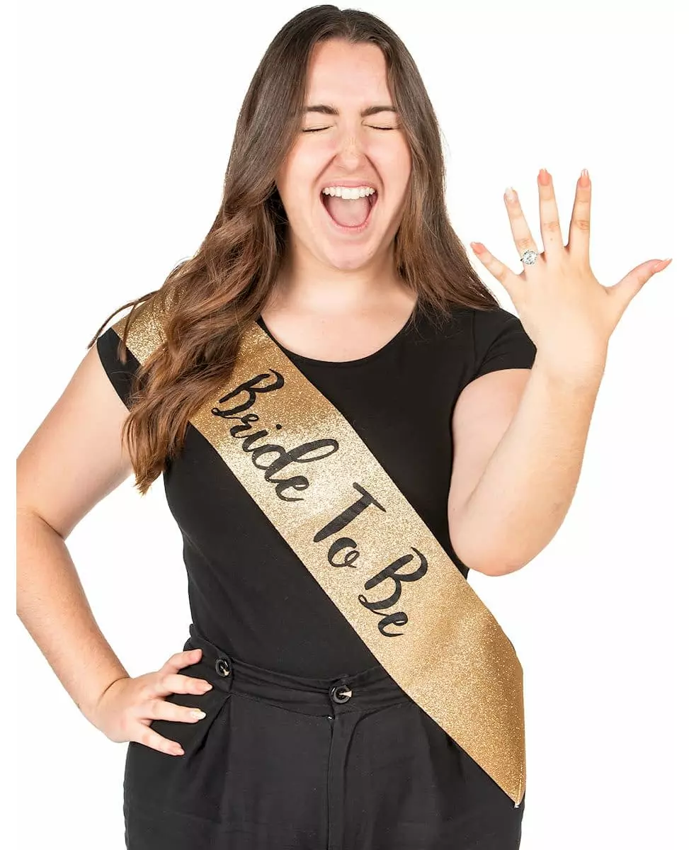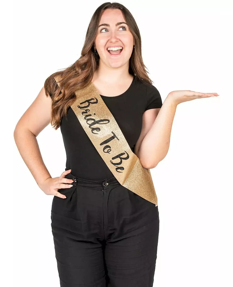 Bli stjernen på utdrikningslaget ditt! Dette glitrende gullskjæret er for voksne. Det har ordene «Bride To Be» i svart. Bruk dette skjæret på et utdrikningslag med jentene før den store dagen! Inkludert tilbehør: 1 skjære. Materiale: Polyester.