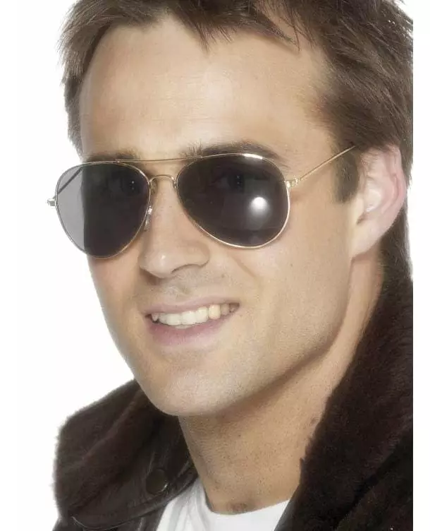 Gullinnfatninger! Pilotbriller med gullinnfatninger. Linsene er tonet, og neseputene og plasttuppene beskytter nesen og baksiden av ørene. Ideelle for å fullføre pilot- eller politikostymet ditt på temafester, til et show eller andre festlige og utkledd arrangementer. Inkludert tilbehør: Briller