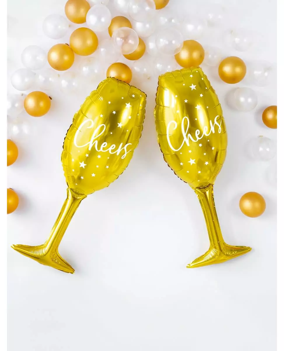 En ballong for å skåle for det nye året! Denne aluminiumsballongen er omtrent 28 x 80 cm. Den er gullfarget og forestiller en champagnefløyte med påskriften «Skål» i hvitt. Blås den opp med luft eller helium for å få den til å fly. Denne ballongen vil være ideell for en glitrende dekorasjon til det nye året! Inkludert tilbehør: 1 ballong Materiale: Aluminium