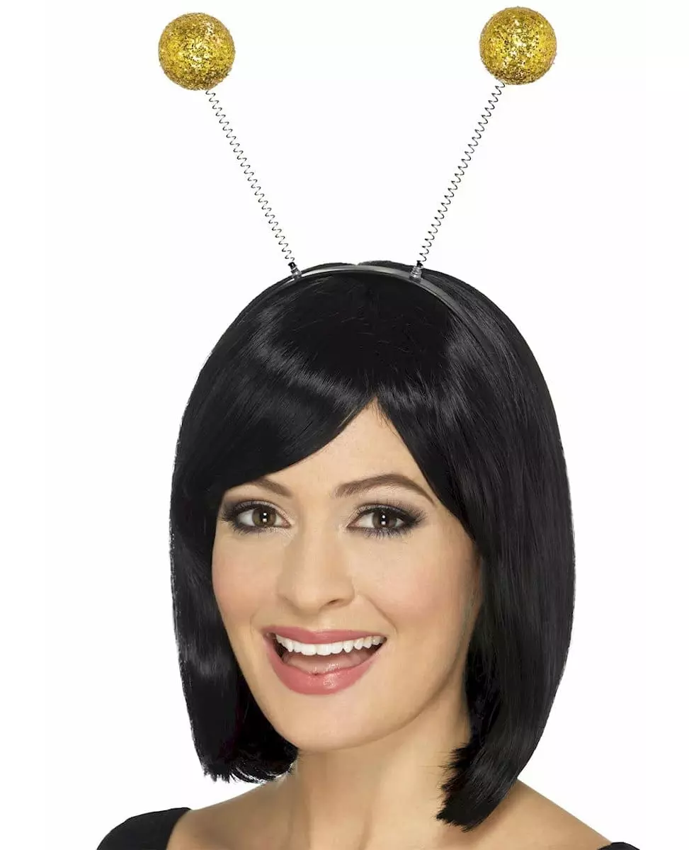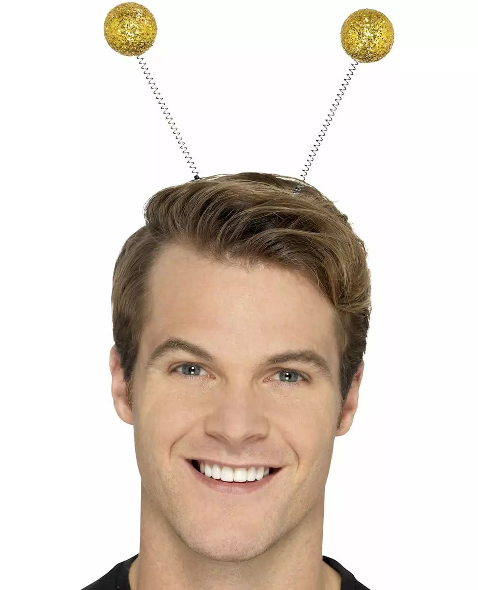 Med gullpaljetter! Dette pannebåndet er for voksne. Det er svart og består av to gullpaljettballer som er festet til sølvfjærer. Det vil være ideelt som tilbehør til antrekket ditt under en diskokveld! Inkludert tilbehør: Pannebånd Materiale: Plast Plast