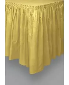 For et perfekt bord ned til minste detalj! Gullfarget plastbordskjørt som måler 73 cm x 426 cm. Det festes med lim og kan brukes på alle bordformer. Unik festlogo Plastmateriale Tilbehør inkludert - Bordskjørt