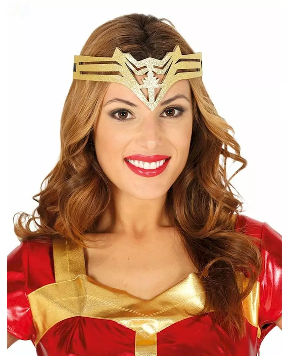 Fantastisk! Dette superheltpannebåndet er for kvinner. Dette gylne pannebåndet er utstyrt med en strikk på baksiden av hodet for å tilpasse seg hodeomkretsen. I midten har den formen som en V som faller tilbake på ansiktet. Denne tiaraen vil være perfekt for å legemliggjøre en superhelt fra en fantasyfilm under karneval eller en superhelt-temafest. Inkludert tilbehør: Tiara