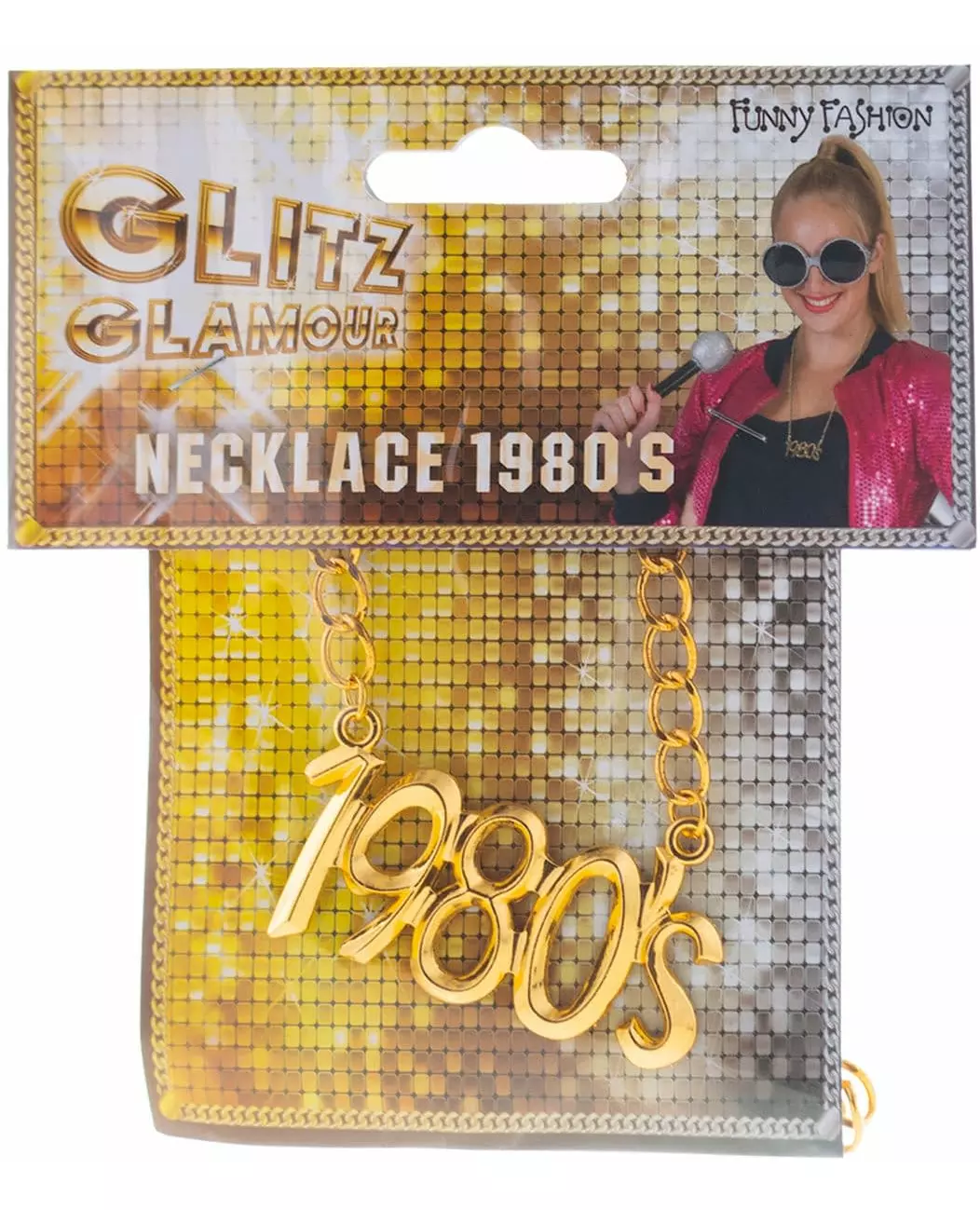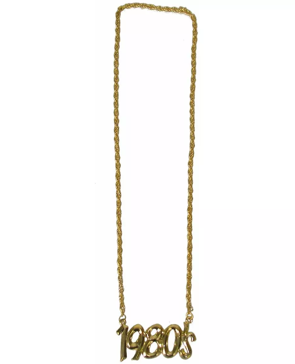 80-tallet er tilbake! Dette 80-tallskjedet er laget av metall. Det inkluderer en lenkekjede og et 80-tallsanheng, alt i gull! Dette kjedet vil være ideelt for å dra tilbake til 1980-tallet for en kostymefest med retrotema! Inkludert tilbehør: Halskjede Materiale: Metall