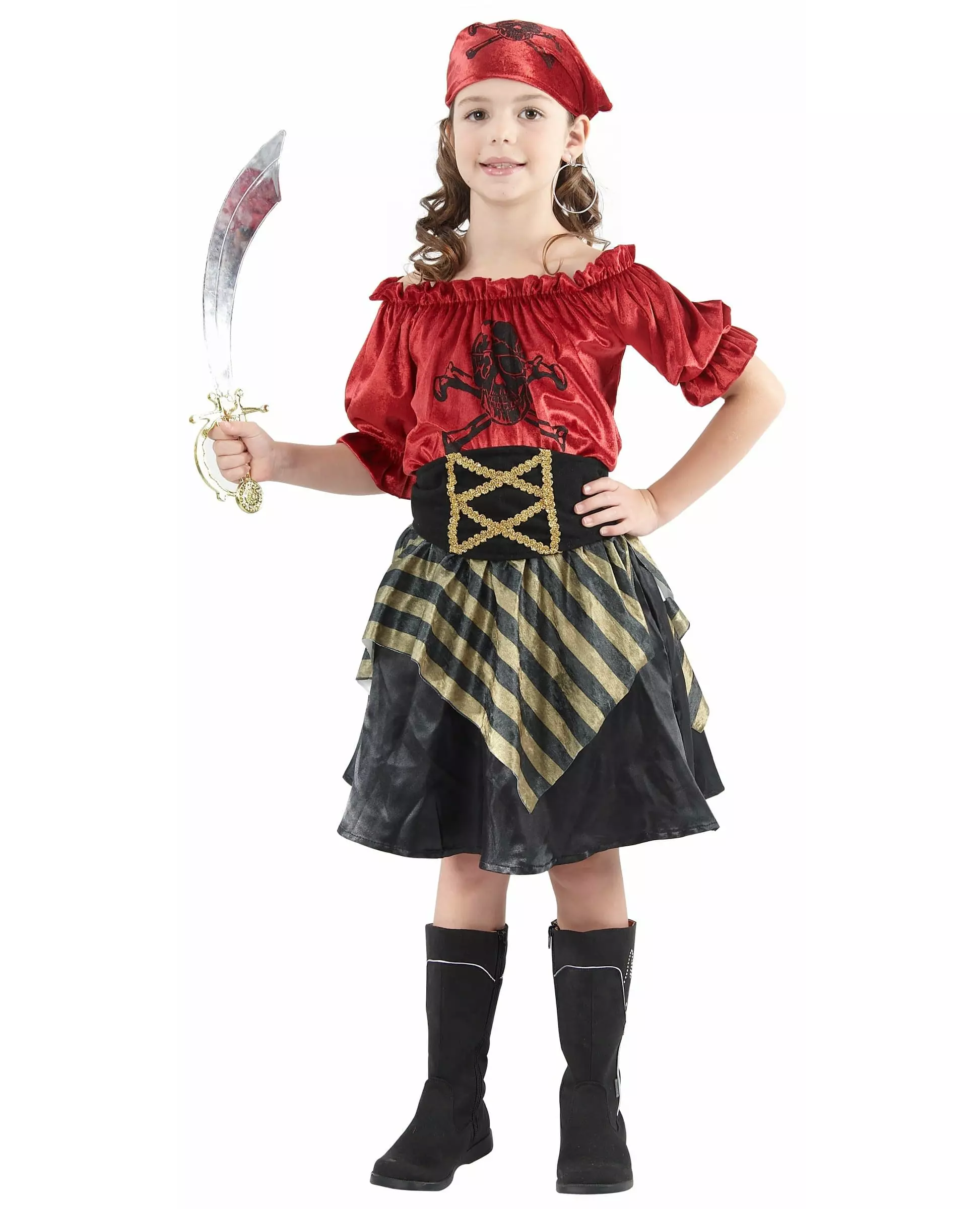 Fløyelseffekt! Dette piratkostymet for jenter består av et skjørt, en topp, en bandana og et belte. Skjørtet er dekorert med et gull- og marineblått stripete overskjørt. Den røde fløyelseffekten på toppen har elastikk i kragen og ermene og er illustrert med et svart "hodeskalle"-trykk. En trykt rød bandana og et belte med imitert gullblonder fullfører anseelsen. Hvem sa at piratkostymer bare var for gutter? Inkludert tilbehør: skjørt med overskjørt, topp, bandana, belte. Materiale: 100 % polyester. Vedlikehold: Håndvaskbar.