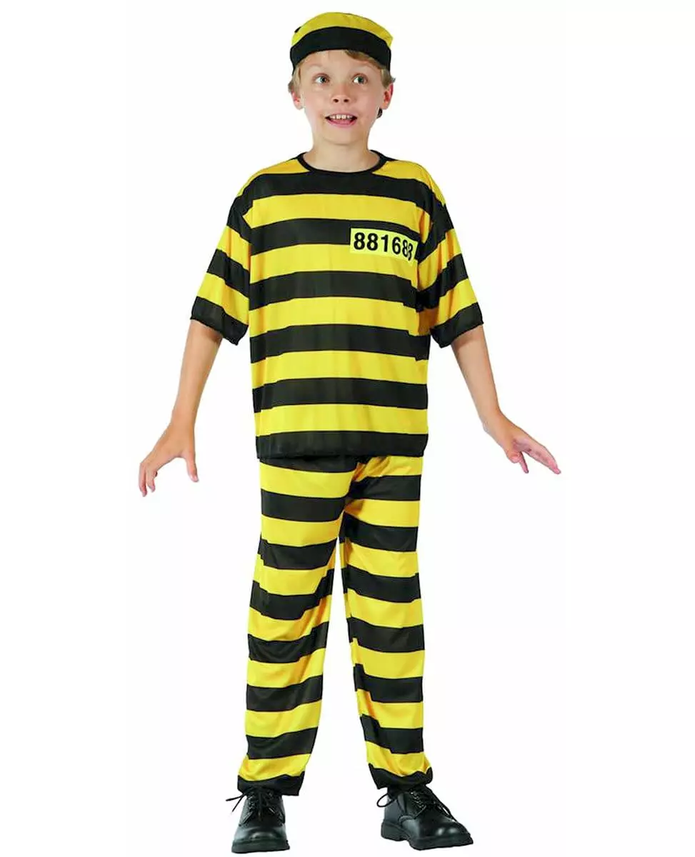 Tagada tagada, her er de! Dette barnekostymet er en fange. Det inkluderer en T-skjorte, bukser og en hatt. T-skjorten har korte ermer og borrelåsfester på baksiden for enkel påkledning. Den er hånet i gult og svart. Et tall vises på brystet for å illustrere fangens nummer. Buksene, med elastikk i livet, matcher toppen med tofargede horisontale striper. Bereten har samme toner som kostymet. Det hele minner oss om de berømte tegneseriebandittene. Dette fangekostymet vil være perfekt til et karneval eller en utkledd bursdagsfest. Inkludert tilbehør: T-skjorte Bukser Hatt Materiale: 100 % polyester Vedlikehold: Håndvask