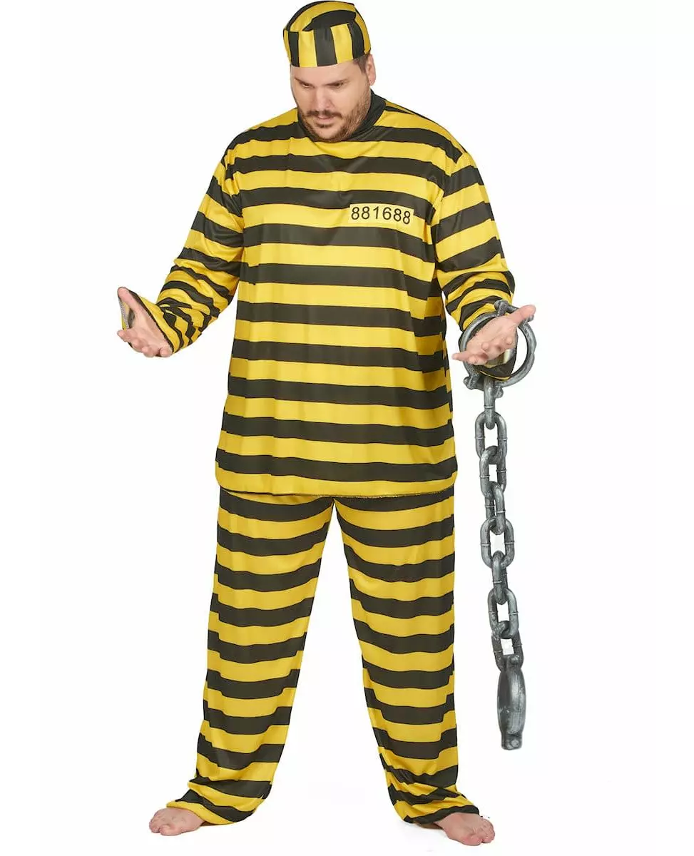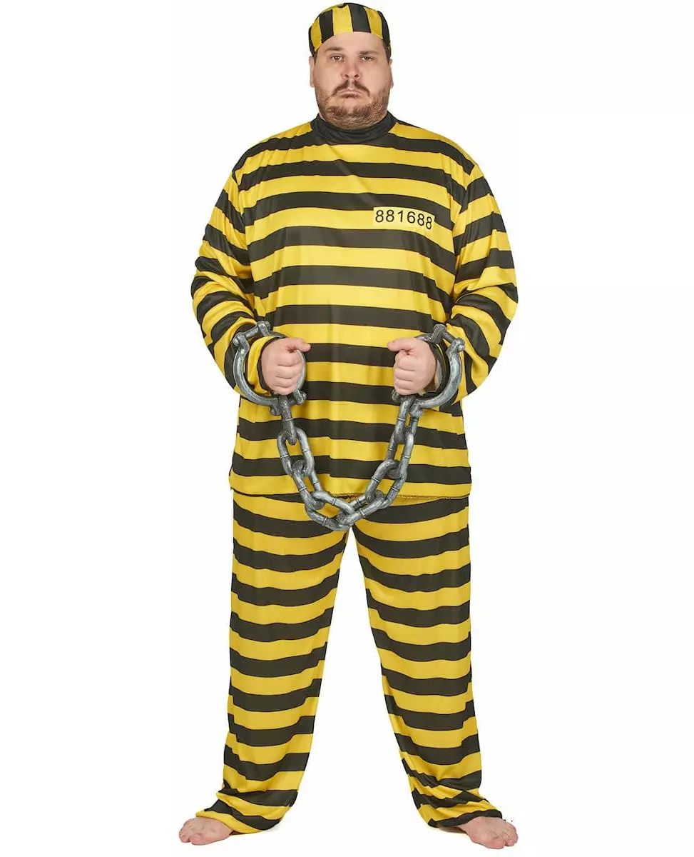 En innsatt på rømmen! Dette store gule fangekostymet er for voksne. Det består av en t-skjorte, bukser og et hodeplagg. De tre delene av kostymet er matchende, med et svart og gult stripete trykk. Det er også dekorert med et innsattnummer på brystet. Dette fangekostymet vil være ideelt for å perfeksjonere karnevalsfesten eller andre utkledningsarrangementer! Inkludert tilbehør: 1 t-skjorte 1 bukse 1 hodeplagg Materiale: 100 % polyester Vedlikehold: Håndvask