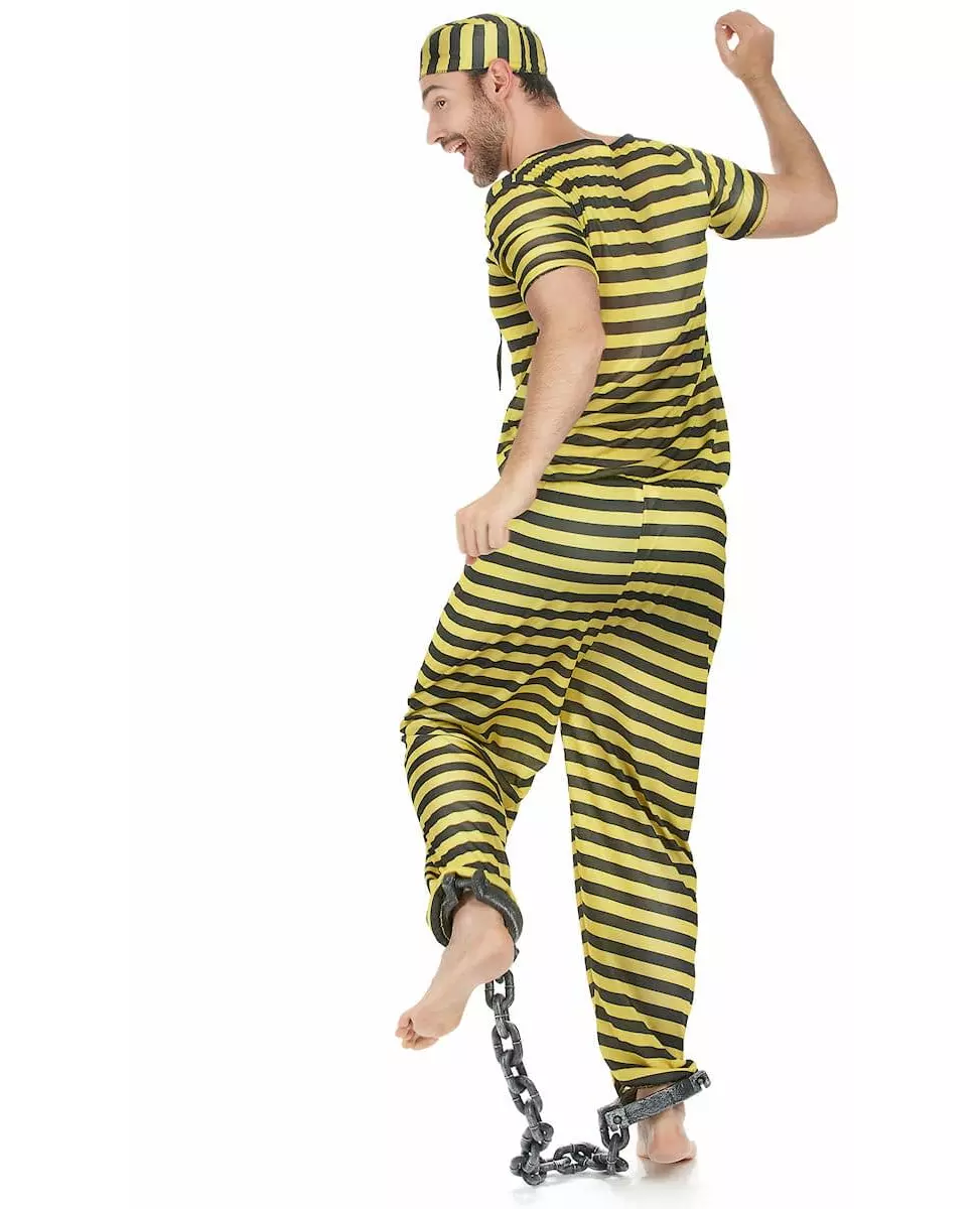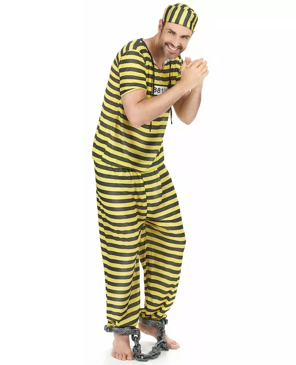 Flukt! Dette gule og svarte fangekostymet for menn består av en topp, bukser og et hodeplagg. Den gul- og svartstripete toppen har et registreringsnummer på brystet. Buksene har en elastisk linning for ekstra komfort. Det matchende hodeplagget vil sette prikken over i-en til dette kostymet. Dette kostymet vil være perfekt for å spille en fange eller en Dalton til en temafest med venner eller familie. Materiale: Polyester