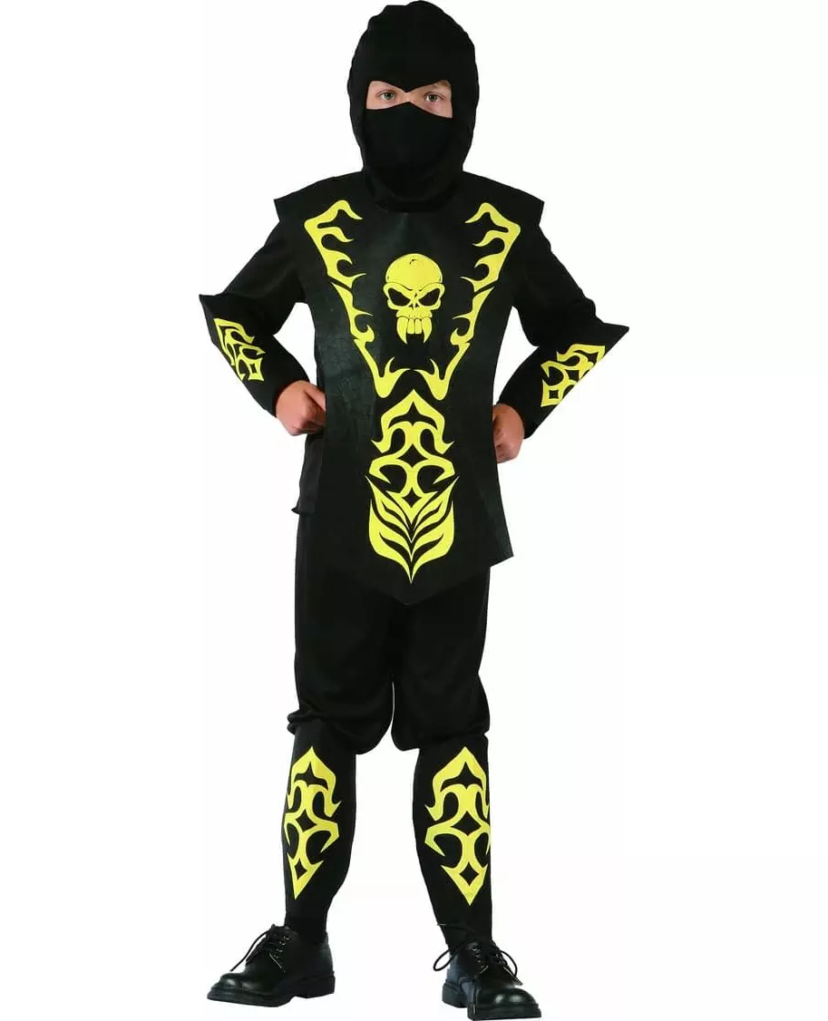 Med flammetrykk! Dette ninja-kostymet for gutter består av en svart hette, en nesemaske, en langermet skjorte og elastiske bukser. Antrekket inkluderer også en brystbeskytter som representerer svart og gul rustning laget av lett skum med hodeskalle- og flammetrykk. Et par håndleddsbeskyttere og et par leggbeskyttere vil sette prikken over i-en på antrekket (sabel og sokker er ikke inkludert). Dette kostymet vil være perfekt for å legemliggjøre en ekte ninja, til karneval, et show eller andre utkledningsarrangementer. Inkludert tilbehør: Hette, rustning, håndleddsbeskyttere, bukser, leggbeskyttere, materiale: 100 % polyester, pleie: Renseri