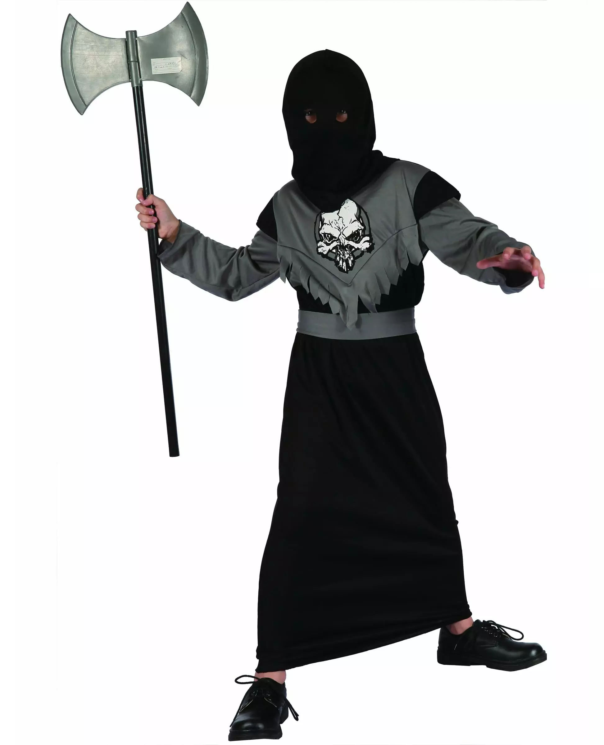Bli en bøddel til Halloween Dette bøddelkostymet for gutter består av en kjole, en hette og et belte (øks og sko er ikke inkludert). Den svarte kjolen har lange grå ermer. Et grått stoff med en hvit hodeskalle er prydet med en hvit hodeskalle. Kjolen lukkes bak med borrelås. Et grått belte lar deg markere midjen. Dette lukkes bak med en stor borrelås. Til slutt fullfører en svart hette anseelsen. Dette har åpninger i øyehøyde. Dette kostymet vil være perfekt for å spille en skremmende bøddel på Halloween-kvelden. Inkludert tilbehør: Kjole Belte Hette Materiale: 100 % polyester Vedlikehold: Håndvask