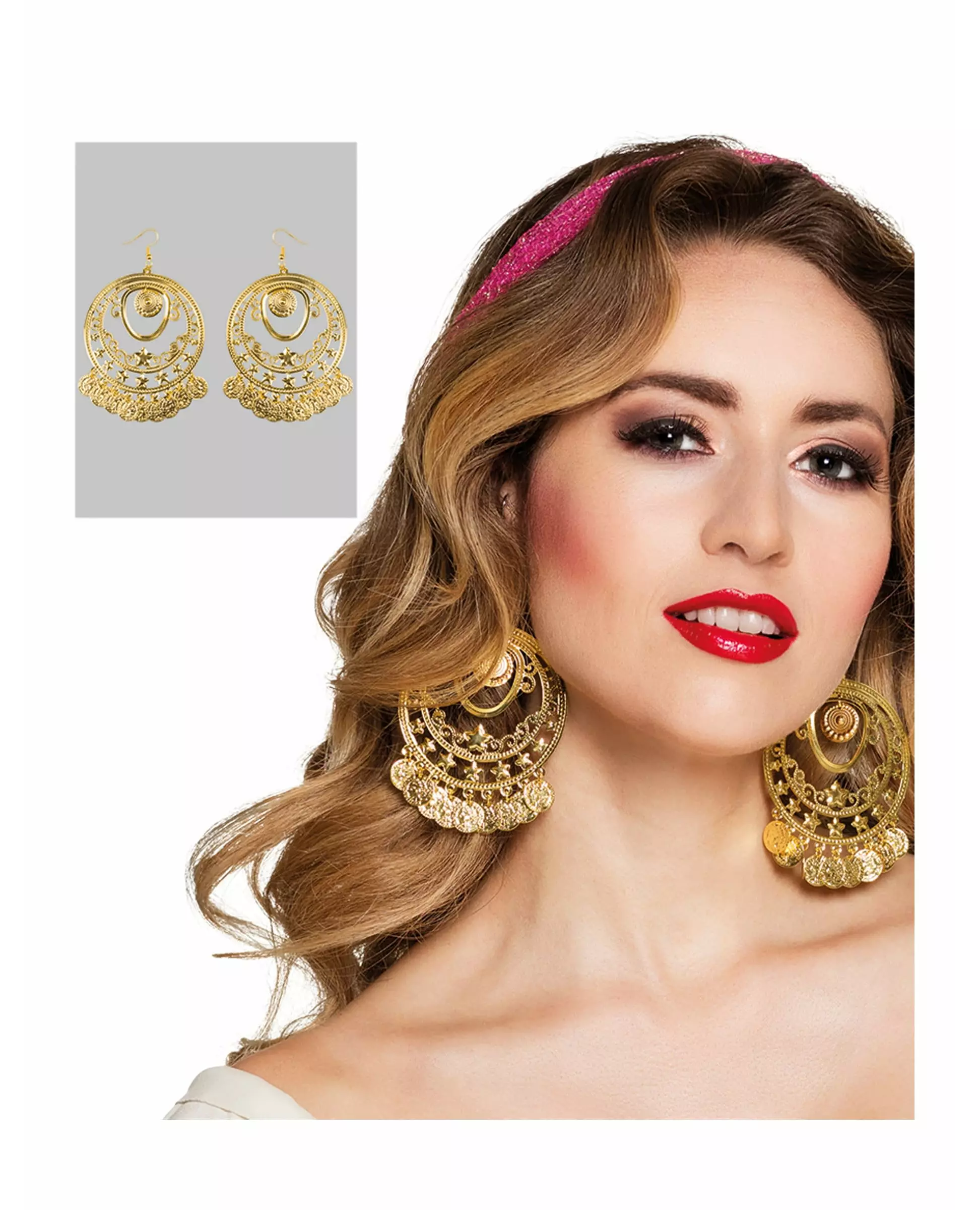 Tenk på å fullføre det orientalske kostymet ditt. Disse orientalske danserøredobbene er laget av gullbelagt metall. De er runde i formen med små deler. Disse øredobbene krever hull i ørene. De vil være perfekte for å fullføre det orientalske danserkostymet ditt til en utkledningsfest. Inkludert tilbehør: 2 øredobber.