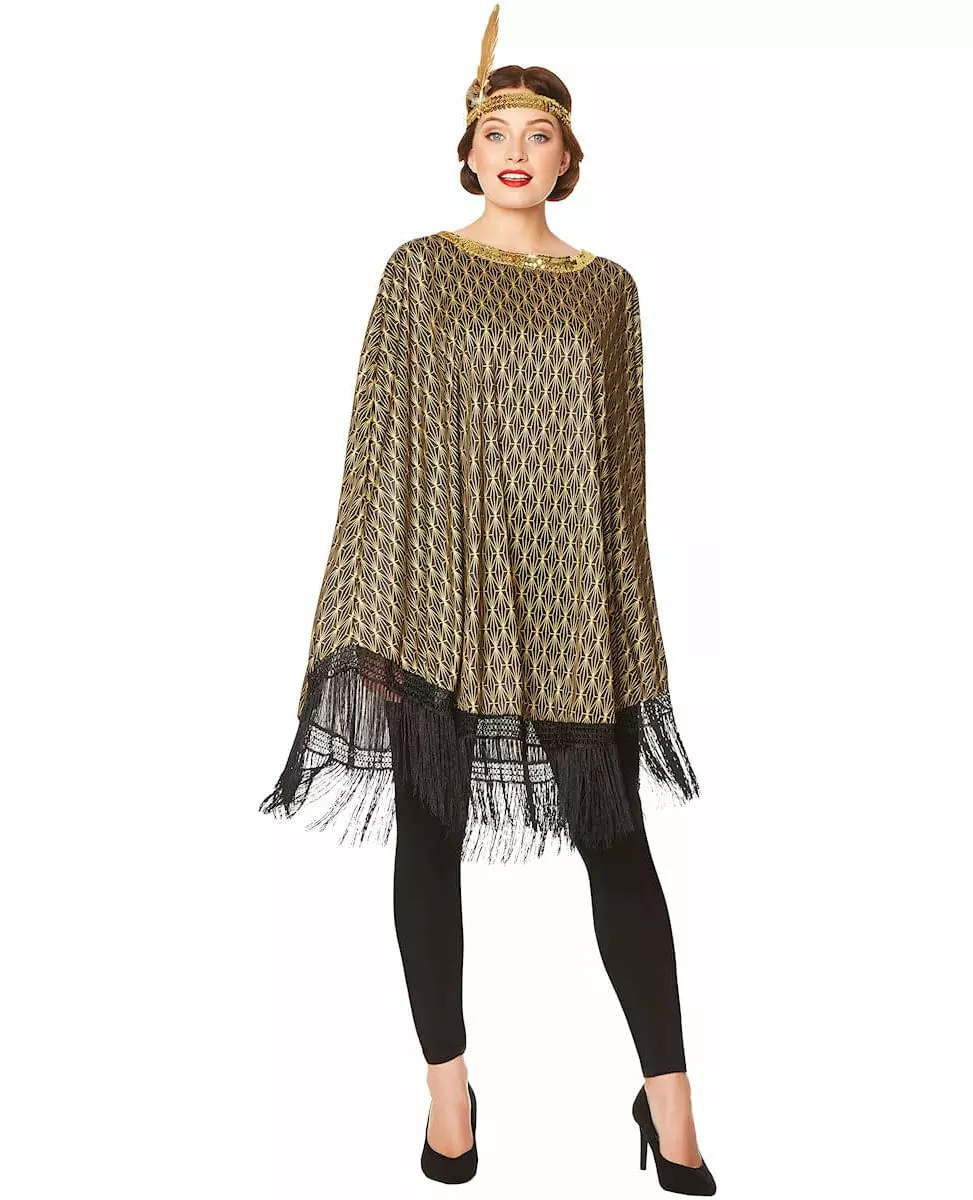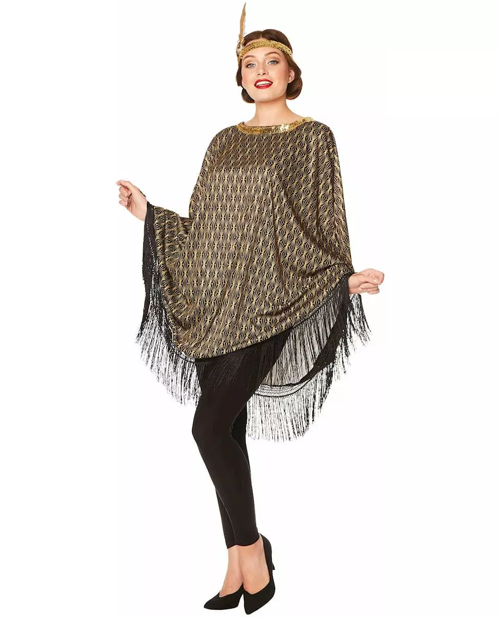 En veldig original Charleston-poncho til 20-årsfesten din! Dette Charleston-poncho-kostymet er for kvinner, det består av en poncho og et pannebånd (leggings og sko er ikke inkludert). Charleston-ponchoen er lang, den når til midten av låret og frynsene som dekorerer den når til kneet. Den er fullstendig trykt med gylne "Gatsby"-mønstre og en frynse med gylne paljetter som pryder halsen. Pannebåndet bruker de samme paljettene som ponchoen, og en fjær fullfører Charleston-looken. Den holdes enkelt på hodet takket være det elastiske materialet. En original måte å kle seg opp til en Charleston-kveld med dette Charleston-poncho-kostymet for kvinner! Inkludert tilbehør: Poncho-pannebånd Materiale: 100 % polyester Stell: Håndvask