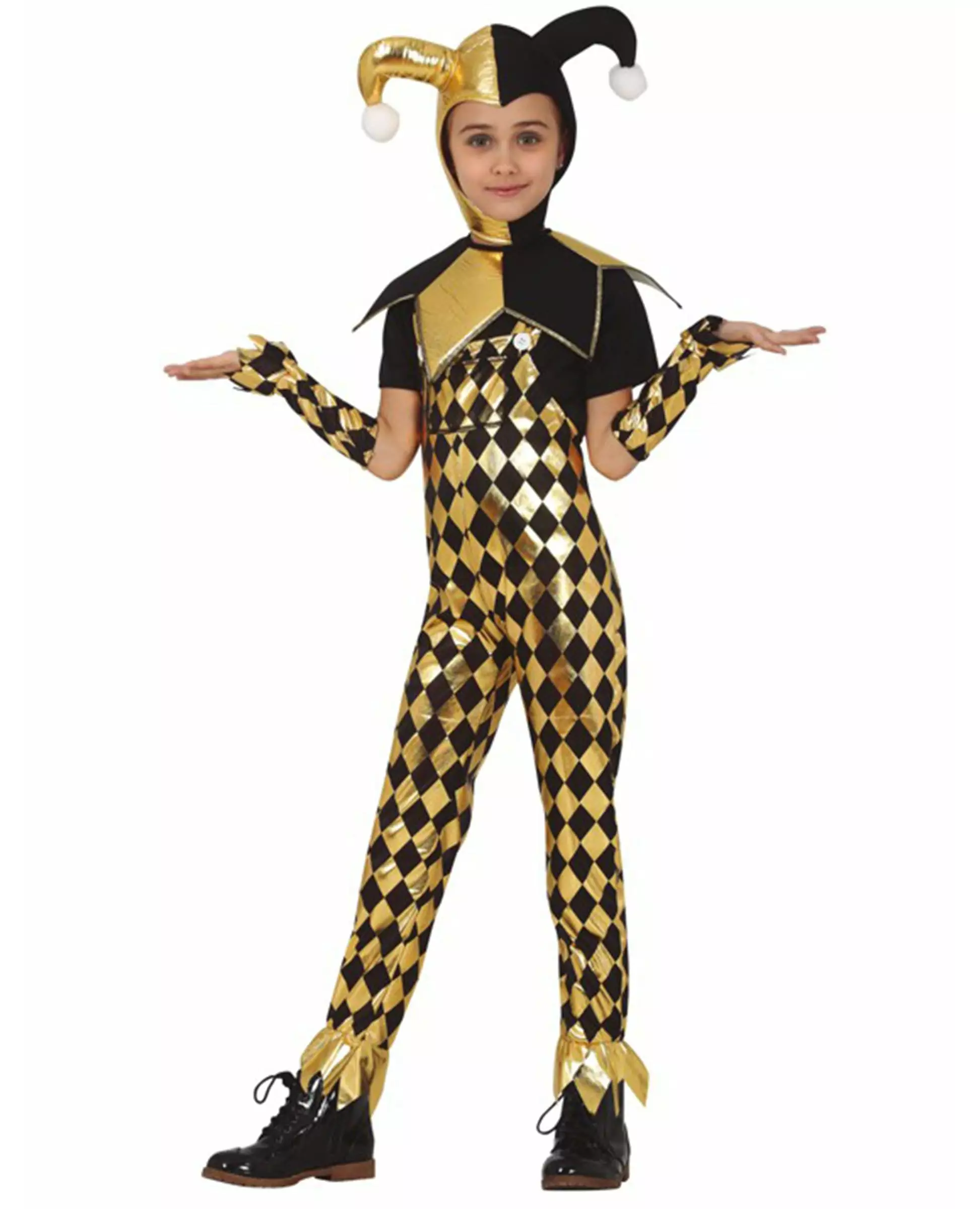 En gyllen harlekin! Dette gyldne harlekinkostymet er for jenter og består av kjeledress, t-skjorte, krage, mansjetter og hodeplagg (sko er ikke inkludert). Kjeledressen er gullfarget med svarte diamanttrykk. Den er bredere ved anklene og er dekorert med to hvite knapper. Den svarte t-skjorten tas på under kjeledressen. Mansjettene har samme mønstre som kjeledressen. De er gullfarget med svarte diamanter. Kragen er vekselvis gull og svart i form av en diamant. Kostymet fullføres av det halvt gullfargede halvt svarte hodeplagget og dekorert med to hvite pomponger. Dette gyldne harlekinkostymet er ideelt for å pynte seg på temafester! Materiale 100 % polyester Stell og vask Håndvask Tilbehør inkludert - Kjeledress - T-skjorte - Krage - Mansjetter - Hodeplagg
