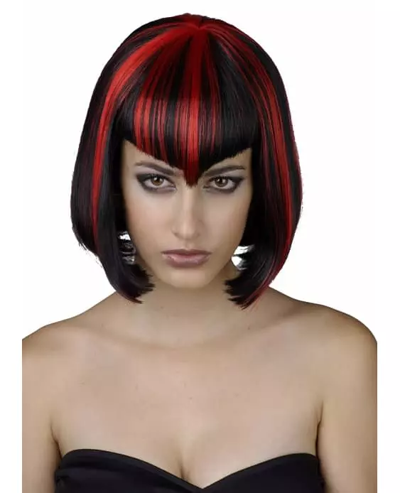 Original pannelugg! Denne fantastiske parykken er svart med røde striper og en bobklipp. Panneluggen er rett. Perfekt som et supplement til kostymet ditt for temafester, Halloween eller karneval. Inkludert tilbehør: Parykkpleie: Håndvask i kaldt vann