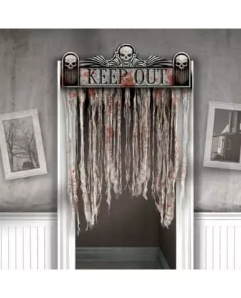 Tør du å gå inn? Dette Halloween-dørforhenget har en tykk pappdel på toppen med et hodeskalletrykk og ordene «KEEP OUT» (HOLD DEG UT). Hvitt nettingstoff farget med falskt blod er limt til den nederste delen. Det er kuttet i strimler for å skape en revet effekt. Denne dekorasjonen, som måler 95 cm bred og opptil 150 cm høy, vil være perfekt for å dekorere inngangsdøren din under en skrekk- og skummel fest som Halloween! Inkludert tilbehør: 1 dørdekorasjon