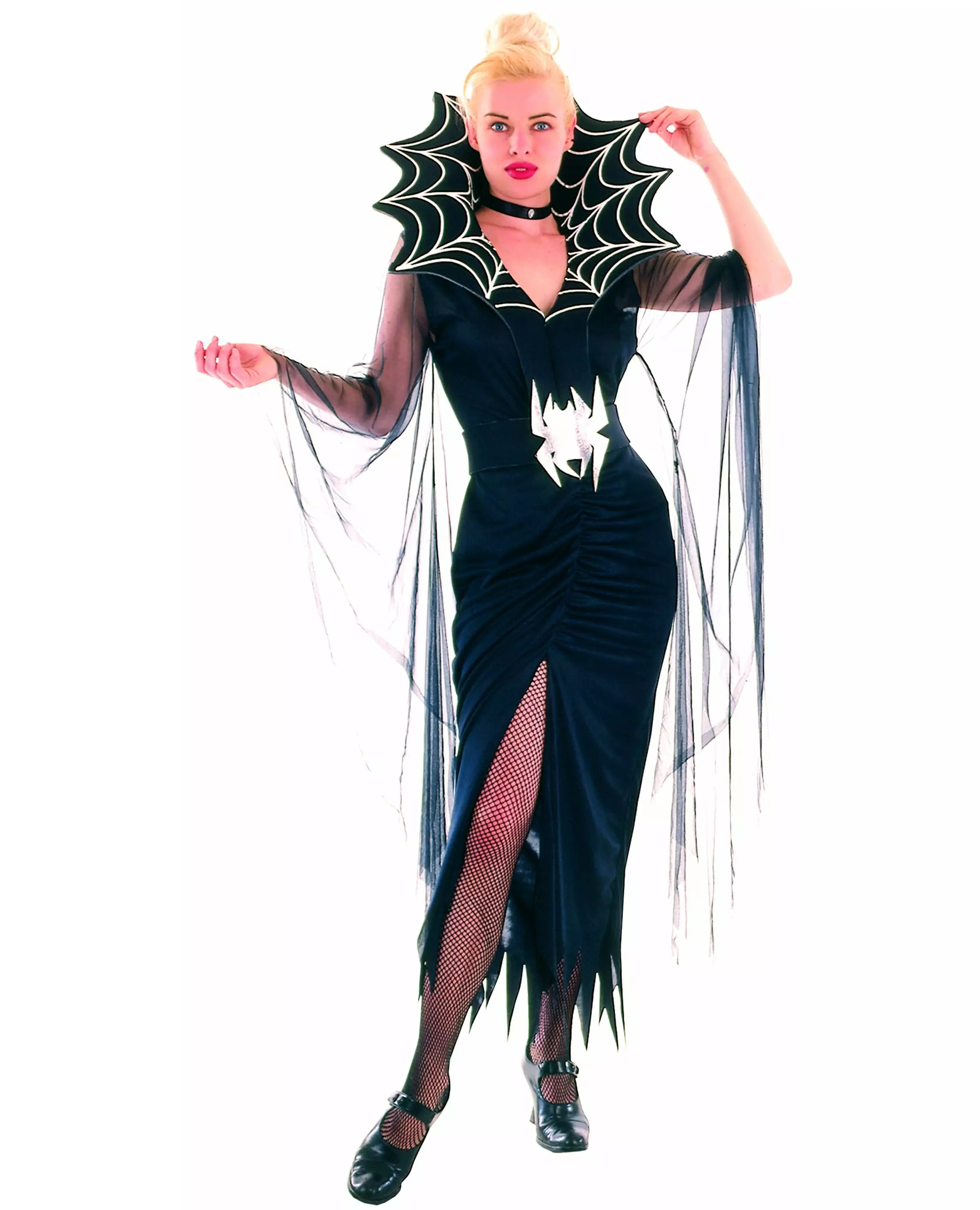 Bli elskerinnen i svart magi i dette Halloween-kostymet. Dette edderkoppkvinne-kostymet består av en kjole, en krage og et belte. Den lange, svarte splittkjolen har svært vide slørermer. Den store kragen med spindelvevmønster er laget av skum for å sikre perfekt passform. Beltet, som har en sølvedderkopp i midten, er også laget av skum. Bli den vakreste edderkoppdronningen til kostymefesten din eller til Halloween. Inkludert tilbehør: Kjole, krage, belte. Materiale: 100 % polyester. Vedlikehold: Håndvask.