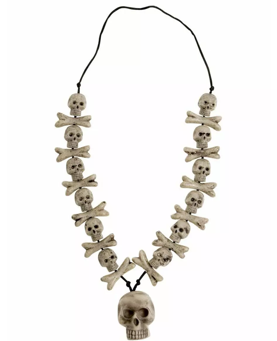 Bli mørkets mester til en kostymefest. Dette hodeskallekjedet for voksne er laget av svart tau. Små beige plasthodeskaller og -bein pryder sidene av kjedet. Det måler totalt 70 cm. En større hodeskalle er plassert i midten av kjedet. Det måler 5 cm. Dette kjedet vil være perfekt for å fullføre skjelett- eller mørkets mester-kostymet ditt til en kostymefest med venner eller for å feire Halloween. «Copyright Widmann SRL». «Copyright Widmann SRL. Inkludert tilbehør: Halskjede. Materiale: 95 % polyetylen, 1 % maling, 4 % stoffsnor.