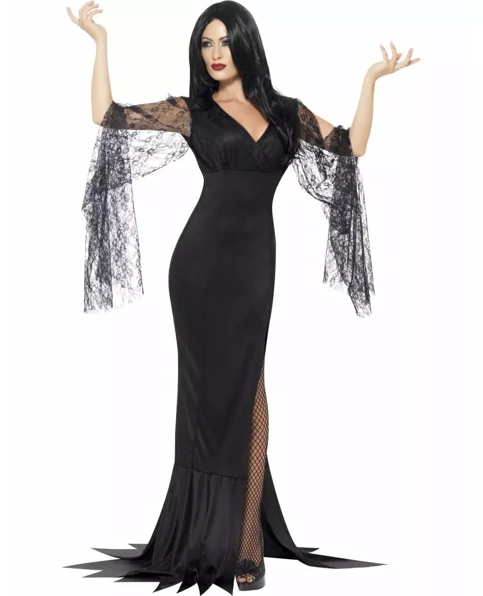 Legitimer en ond og sexy heks til Halloween Dette heksekostymet for kvinner består av en kjole (strømpebukser og sko ikke inkludert). Den lange kjolen er svart, med blonderermer. På brystet er kjolen dekket med samme blonder. Nederdelen av kjolen er kuttet i spisser for å fremheve hekseeffekten. Sistnevnte er splitt på siden for å avsløre deler av beina dine. Denne kjolen er enkel å ta på uten lukking. Dette heksekostymet lar deg lage forferdelige eliksirer samtidig som du forblir sexy på Halloween-kvelden. Inkludert tilbehør: Kjole Materiale: 100 % polyester Pleie: Håndvask
