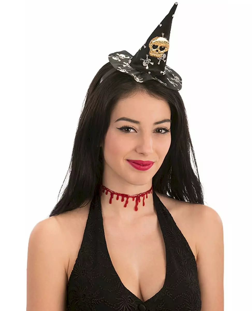 En pen heks! Dette tilbehøret er en minihatt for kvinner. Den forestiller en heksehatt med en spiss form. Den er trykt med små sølvhodeskaller. I midten er det et gyllent skjeletthode med hjerteformede øyne. Denne minihatten holdes på et svart pannebånd. Den vil være perfekt som et supplement til heksekostymet ditt til Halloween!. Inkludert tilbehør: Minihatt Materiale: 100 % polyester