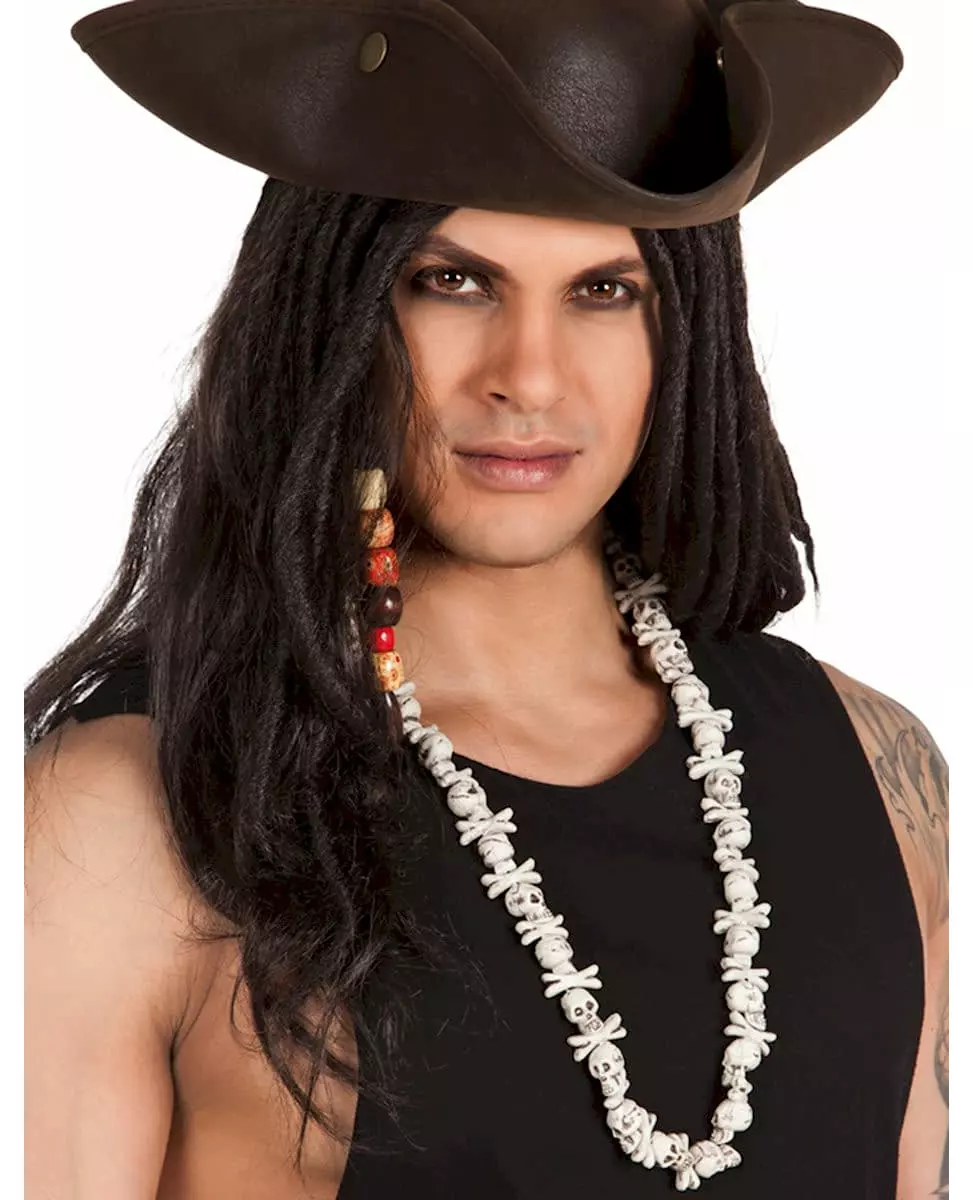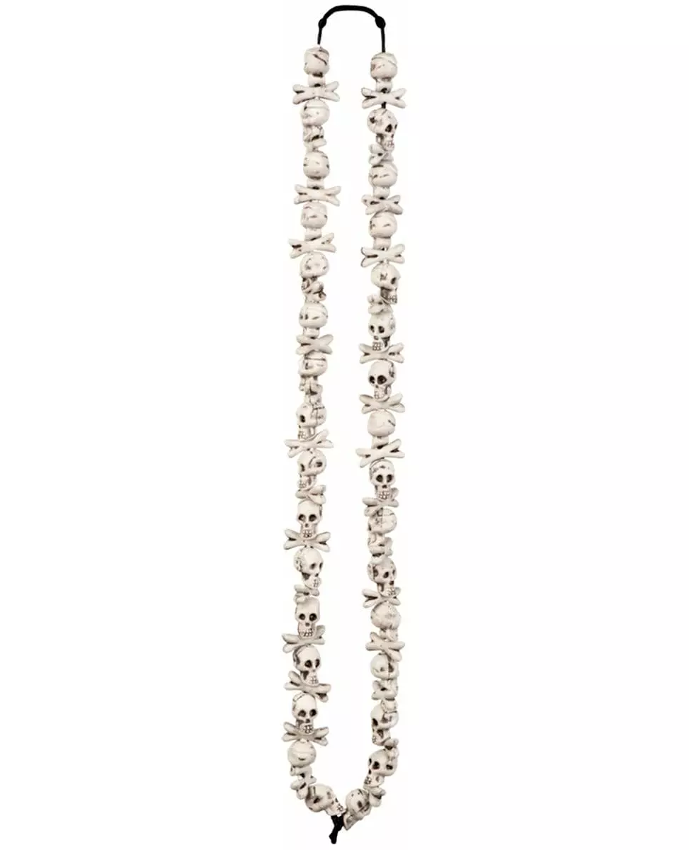 Et makabert trofé! Dette halskjedet utsmykket med flere hvite hodeskaller gir et uhyggelig preg til ethvert mørkt eller ondt antrekk. Hver hodeskalle er plassert med små kryssede bein for å forsterke den skremmende effekten. Perfekt for å fullføre en piratforkledning, et Halloween-kostyme eller en karakter rett fra et morbidt univers, vil dette halskjedet raskt bli det sentrale elementet i et forstyrrende og originalt utseende. Inkludert tilbehør: 1 halskjede