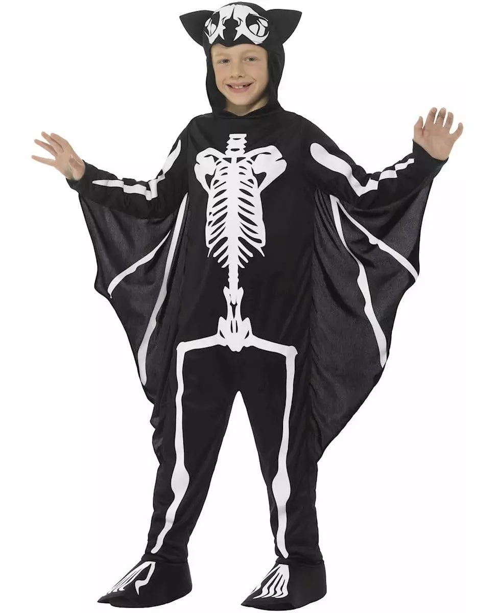 En flaggermus! Dette skjelett-flaggermuskostymet for barn består av en jumpsuit. Jumpsuiten er svart. Den er trykket med et hvitt skjelett. En hette som representerer skjeletthodet til en flaggermus er sydd på jumpsuiten. Flaggermusvinger er også integrert i denne jumpsuiten. Dette skjelett-flaggermussettet vil være perfekt for barnet ditt på Halloween! Inkludert tilbehør: Jumpsuit Materiale: 100 % polyester Pleie: Håndvask
