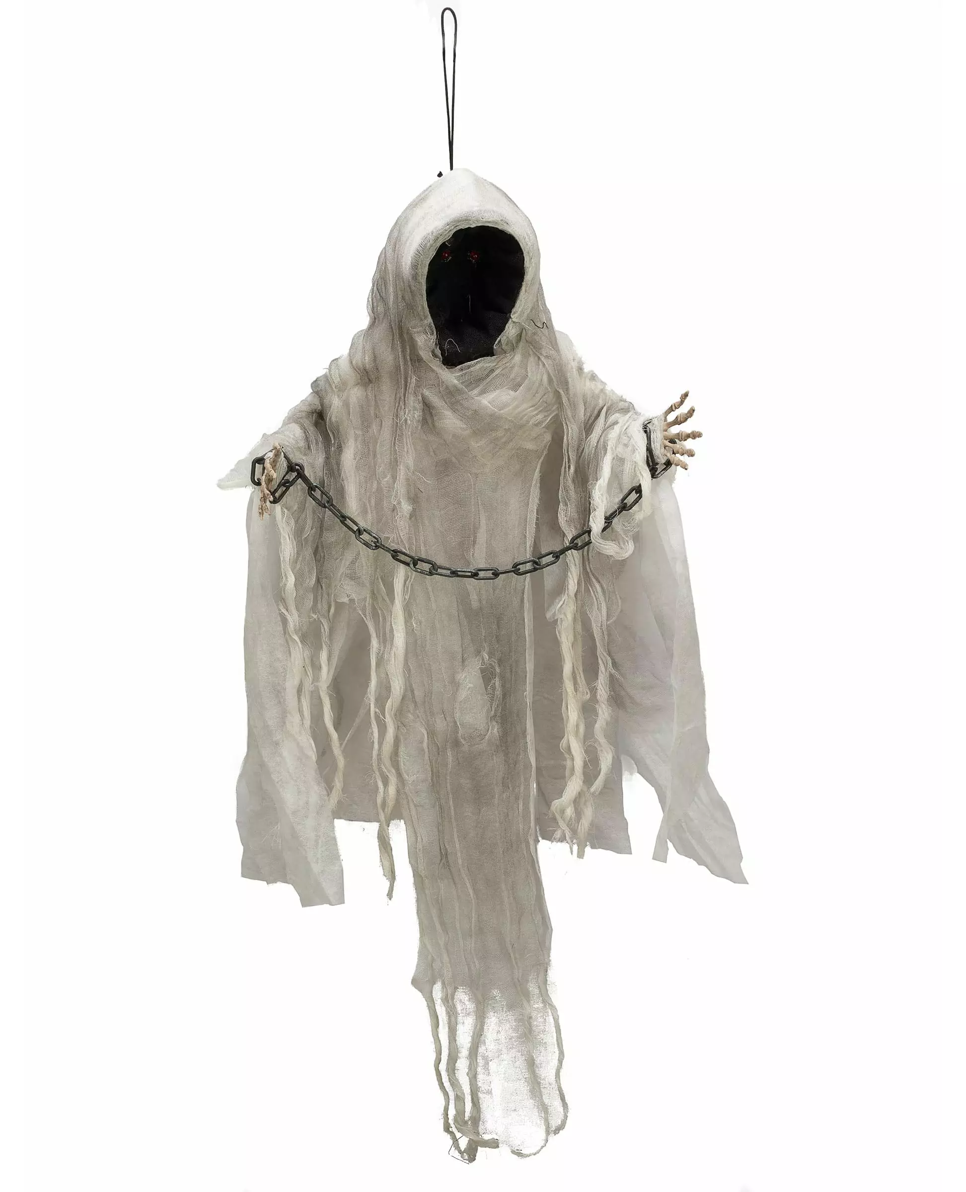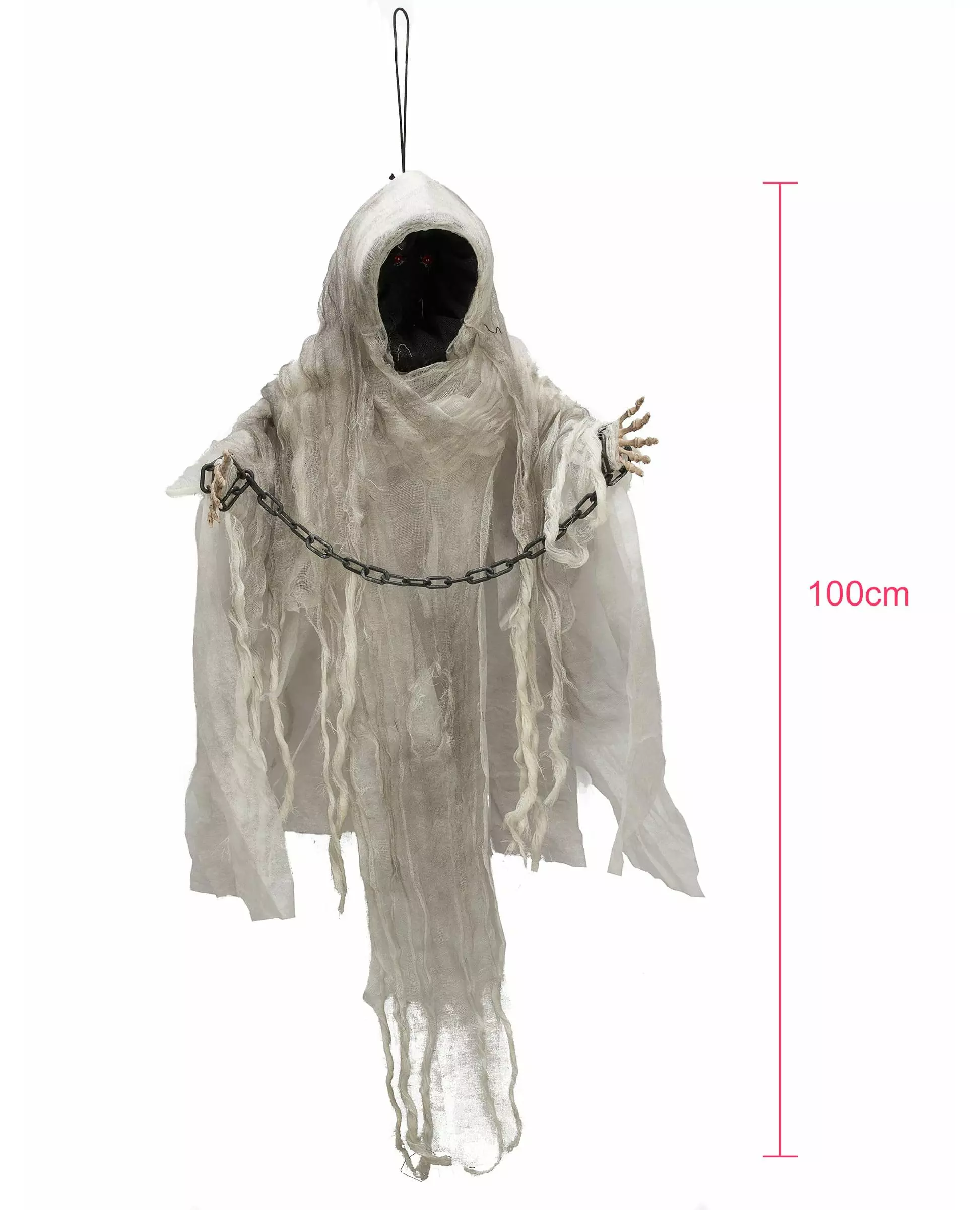 Usynlig under kappen. Dette ansiktsløse, lenkede skjelettet skal henges opp. Det måler omtrent 100 cm og har metallinnrammede armer, slik at du kan plassere dem slik du ønsker. Takket være 3 LR44-knappbatterier (ikke inkludert) vil skapningens tomme øyehuler lyse opp i et uhyggelig rødt for å perfeksjonere Halloween-stemningen!. Inkludert tilbehør: Skjelett