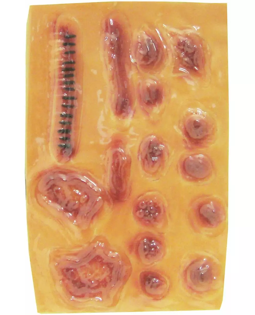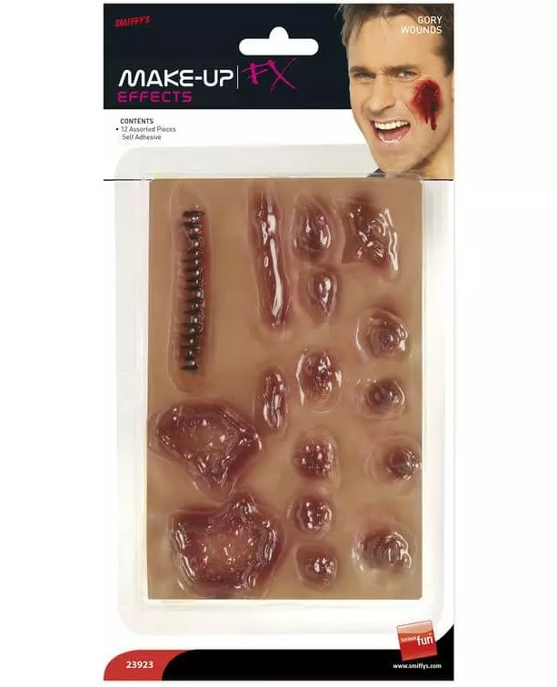 Mange muligheter! Dette sårsettet i Hollywood-stil inkluderer blodige arr, lemlestelser og farget hud. Disse myke sårene er selvklebende. Dette settet er ideelt for å fullføre et Halloween-kostyme. Inkludert tilbehør: Arr, lemlestelser, hud