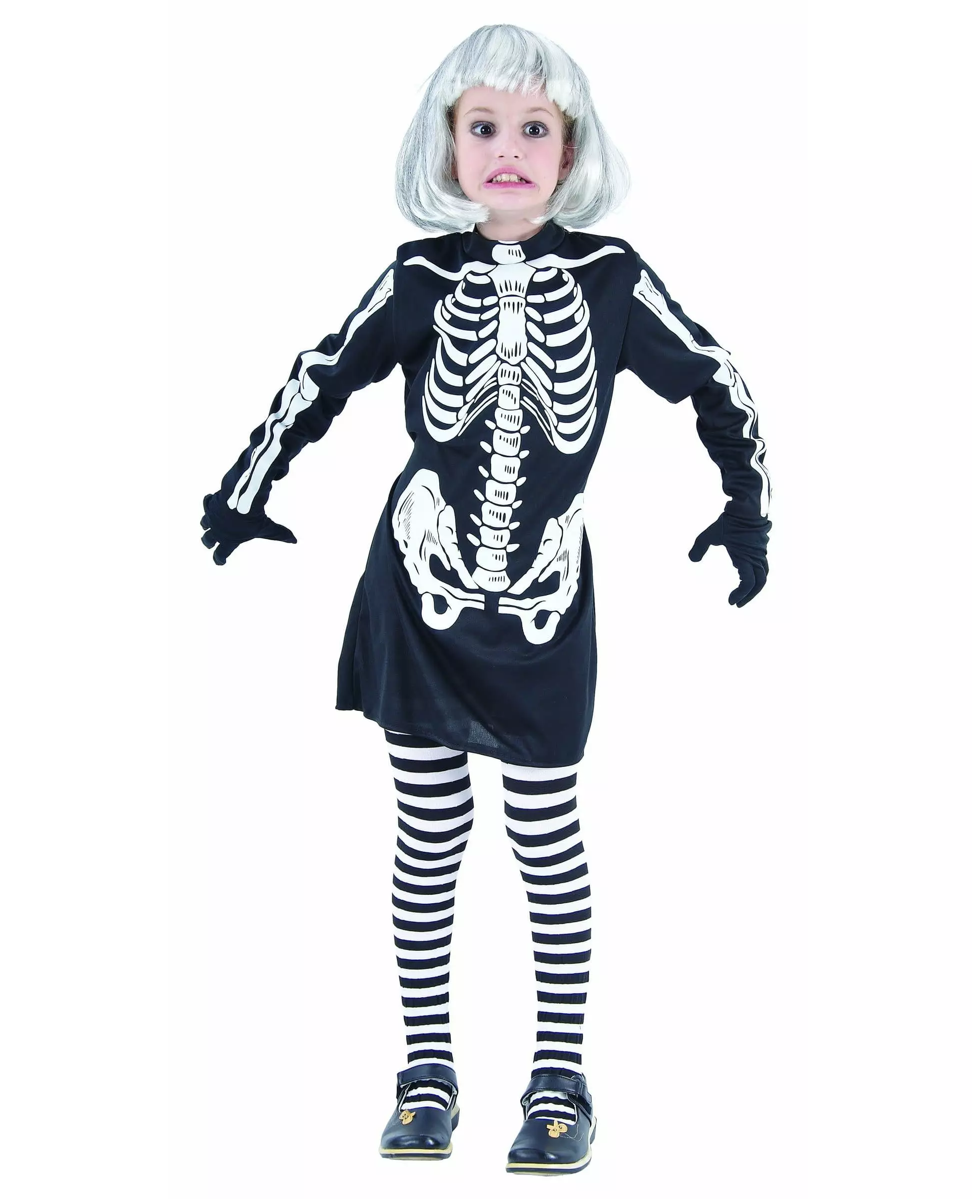 Komfortabelt antrekk å ha på seg! Dette Halloween-skjelettkostymet for jenter består av en kort svart kjole med lange ermer med flockede bein (strømpebukser ikke inkludert). Antrekket er laget av mykt stoff, og borrelås på baksiden gjør det enkelt å ta på seg. Kostymet vil være perfekt til Halloween-kvelden eller andre utkledningsarrangementer. Inkludert tilbehør: Kjole Materiale: 100 % polyester Pleie: Håndvask