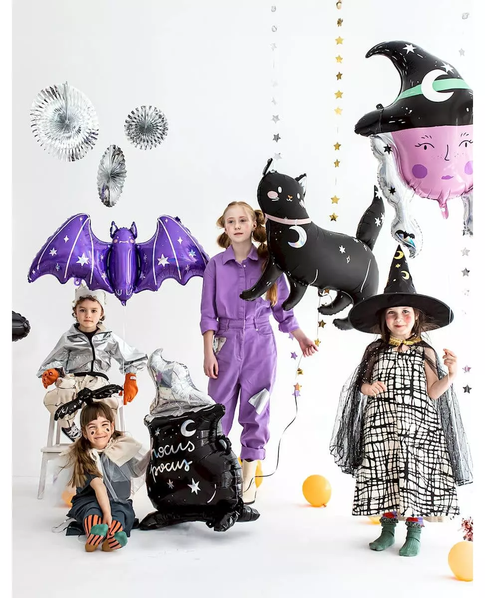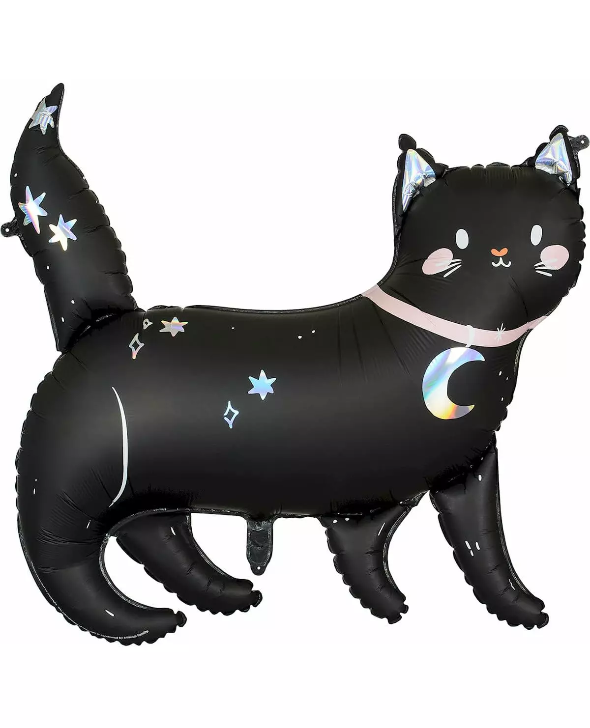 En søt svart katt med iriserende dekorasjoner! Denne ballongen, omtrent 96 x 95 cm, er laget av aluminium. Den er formet som en svart katt med rosa halsbånd, dekorert med en måne og iriserende stjerner. Du kan blåse den opp med luft ved hjelp av et sugerør eller med helium. En ideell svart katteballong for å lage en søt dekorasjon til Halloween!. Inkludert tilbehør: 1 ballong Materiale: Aluminium