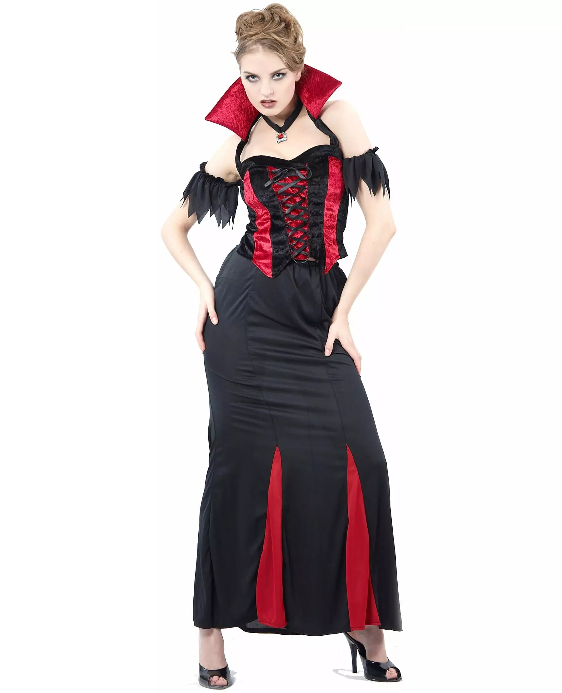 Halskjede med presise falske steiner! Dette vampyrkostymet for kvinner inkluderer en rysjert bustier, et langt skjørt og et halskjede. Den røde og svarte toppen har et fløyelslignende materiale, mens overdelen gir et glamorøst preg. En stor rød rysjer er sydd fast på stroppene, og to svarte armbånd er sydd fast på bustieren. Midjen på det lange svarte og røde skjørtet er elastikk for komfort. En falsk rød edelsten er innsatt på strassmedaljongen, som henger fra en pen svart båndchoker. Dette vampyrkostymet vil være ideelt for utkledningsfester, til et show eller til Halloween. Inkludert tilbehør: Bustier med krage Skjørt Halskjede Materiale: 100 % polyester Stell: For hånd