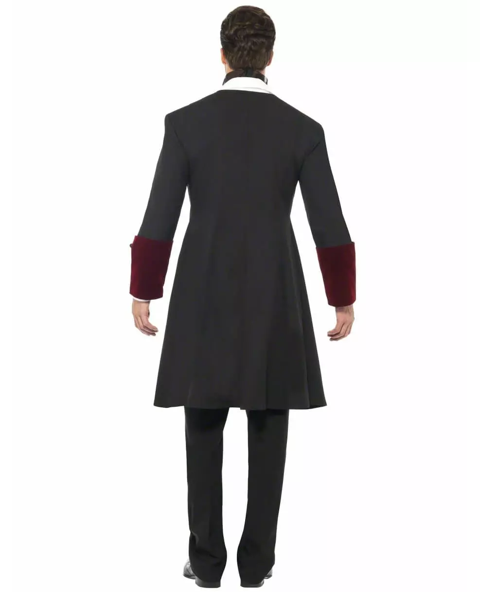 En raffinert effekt garantert! Dette vampyrkostymet for menn består av en lang jakke og en svart jabot. Jakken er svart og burgunder, og har elegante knapper på ermene og foran. En liten burgunderfarget fløyelsvest er integrert i jakken; den har to store svarte knapper som holder den lukket. En svart lerretsjabot vil pynte antrekket ditt og festes rundt halsen med borrelås. Dette kostymet vil være ideelt for å legemliggjøre en raffinert karakter på Halloween-festen eller et kostymearrangement. Inkludert tilbehør: Jakke med integrert vest Jabot Materiale: 100 % polyester Pleie: Håndvask