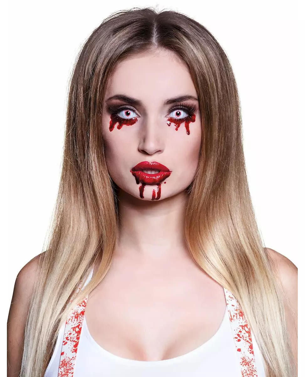 Våg å bruke linser! Disse nyhetskontaktlinsene for voksne er hvite med bloddråper. De måler 14,5 mm i diameter. De kan ikke brukes i én uke etter åpning. De oppfyller standardene CE0120, ISO9001, ISO13485 og KGMP. Husk å lese bruksanvisningen som følger med disse linsene før bruk. Dette produktet vil være perfekt for å fullføre antrekket ditt på et kostymearrangement. Inkludert tilbehør: Linser Materiale: 57 % polyhema, 43 % vann