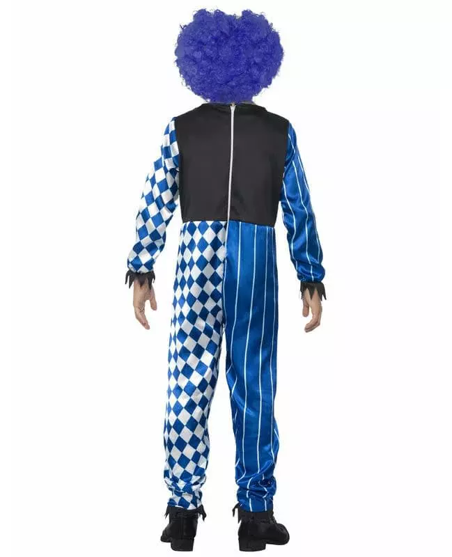 Forvandle deg til en skrekkklovn på Halloween-kvelden. Dette skremmende klovnekostymet for barn består av en jumpsuit og en parykk med maske (sko ikke inkludert). Klovnejumpsuiten er blå og hvit i satengstoff. Falske blodflekker er flocket på forsiden av jumpsuiten. Svarte pigger er på kragen, ermene og bena. Denne jumpsuiten lukkes bak med glidelås. Klovneparykken er blå. Den er festet til en falsk hjerne og en halv klovnemaske laget av stivt skum. Halvmasken har åpninger ved øyne og munn. Dette skremmende klovnekostymet vil være perfekt for å skremme vennene dine på Halloween-anledninger. Tilbehør inkludert: Jumpsuit-parykk med maske Materiale: 100 % polyester Stell: Håndvask