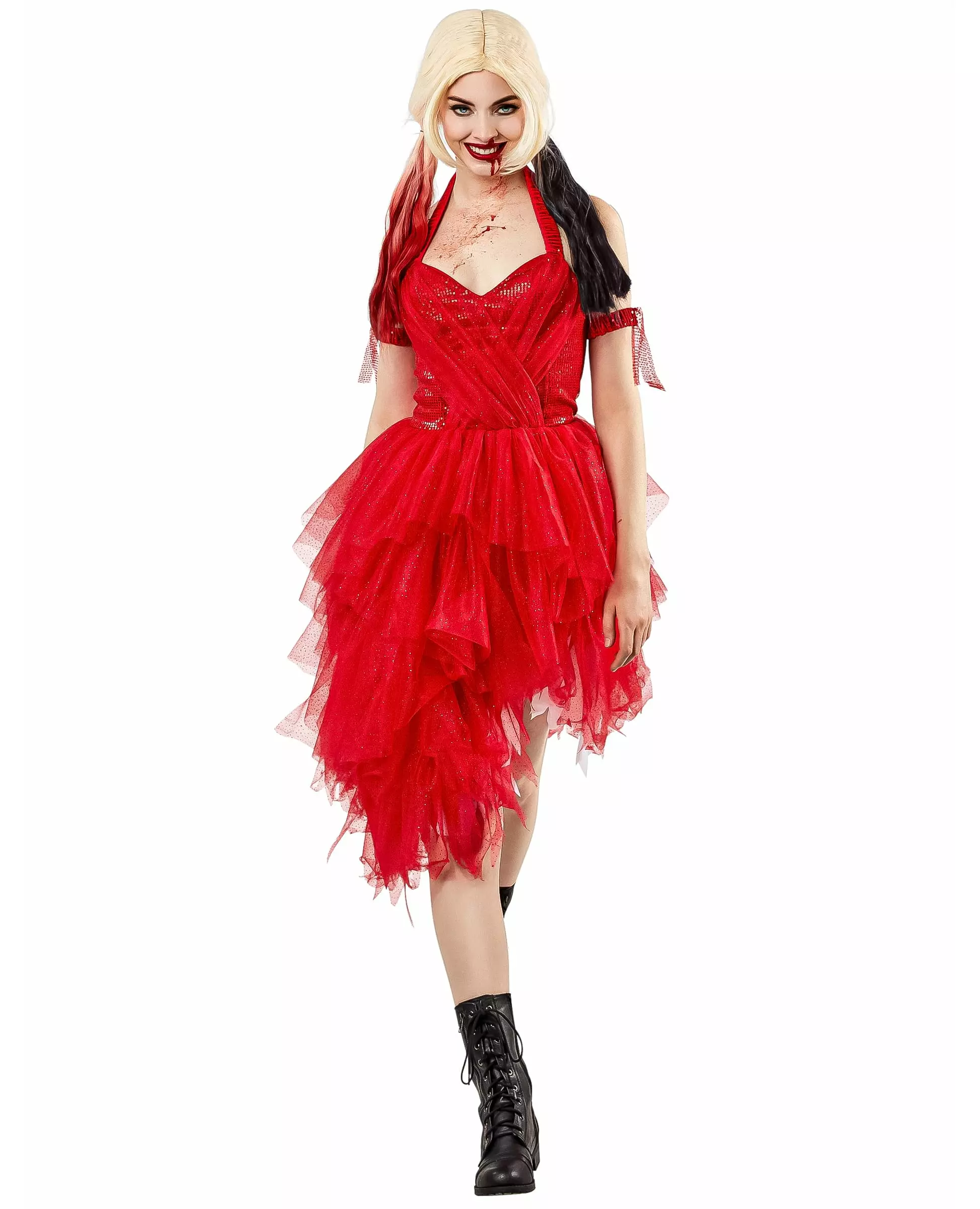 Bli Harley Quinn til Halloween-festen din! Denne røde Harley Quinn-kjolen er offisielt lisensiert av Suicide Squad 2™ og består av en kjole, et armbånd og en underskjørt. Kjolen har åpen rygg og ingen ermer. Toppen er dekorert med paljetter og tyll foran. Den har en hjerteformet bustier. Nederdelen av kjolen er asymmetrisk og består av flere lag med rød tyll med en skinnende effekt og en underskjørt som gir en mer voluminøs effekt. Armbåndet er rødt og dekorert med paljetter og tyll. Denne røde Harley Quinn™-kjolen vil være perfekt for å redde verden til Halloween-festen din!. Inkludert tilbehør: Kjole 1 armbånd Materiale: 100 % polyester Vedlikehold: Håndvask
