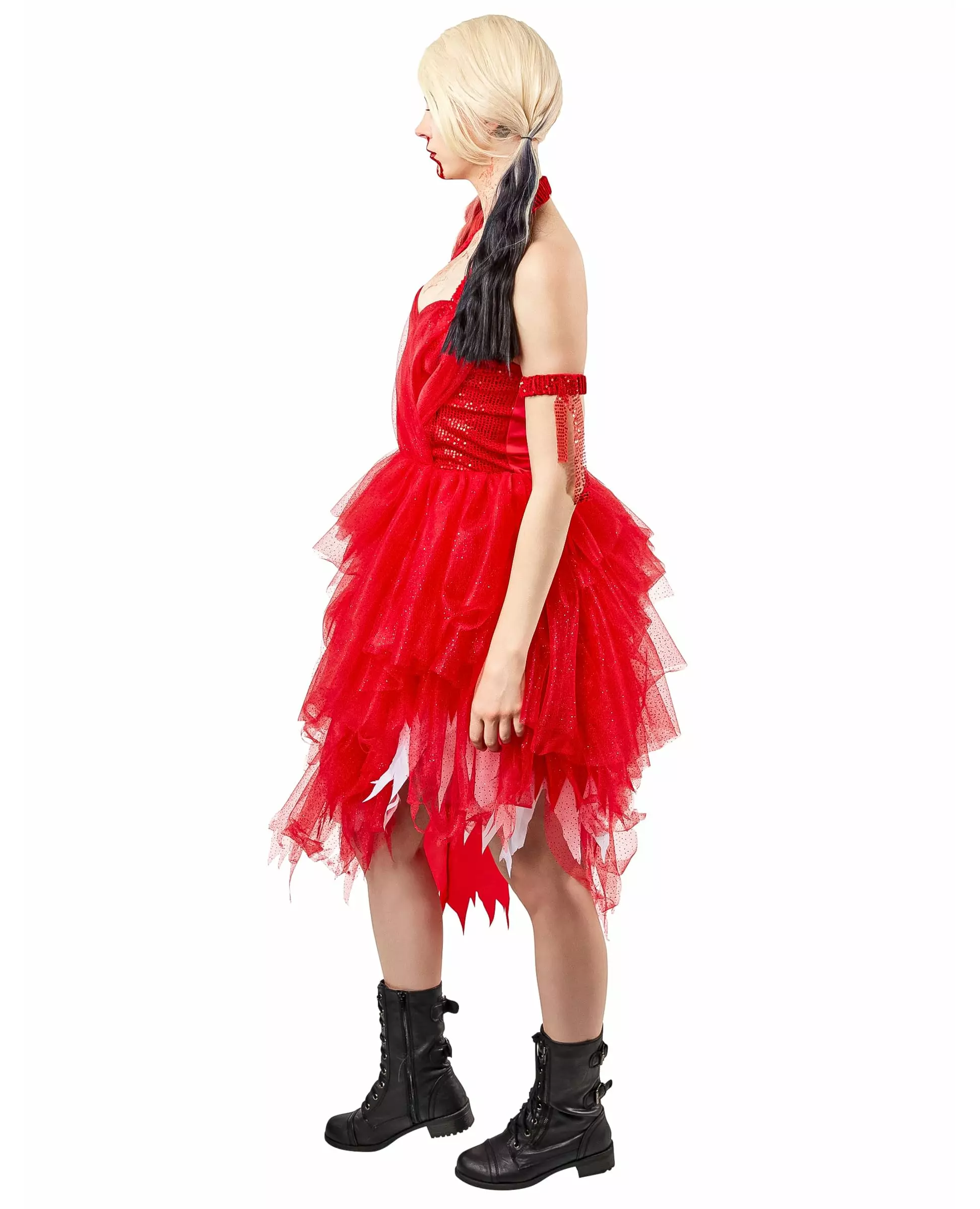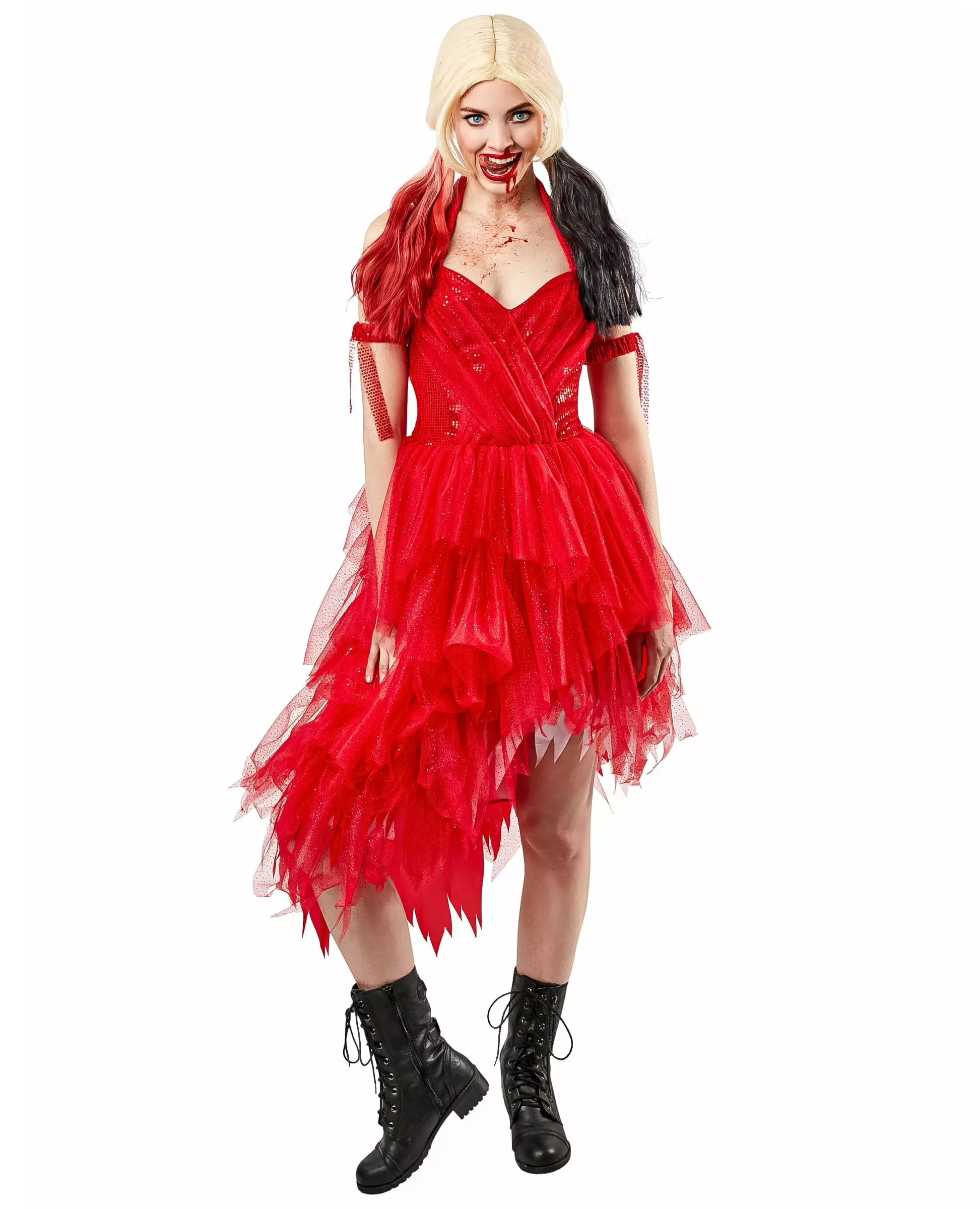 Bli Harley Quinn til Halloween-festen din! Denne røde Harley Quinn-kjolen er offisielt lisensiert av Suicide Squad 2™ og består av en kjole, et armbånd og en underskjørt. Kjolen har åpen rygg og ingen ermer. Toppen er dekorert med paljetter og tyll foran. Den har en hjerteformet bustier. Nederdelen av kjolen er asymmetrisk og består av flere lag med rød tyll med en skinnende effekt og en underskjørt som gir en mer voluminøs effekt. Armbåndet er rødt og dekorert med paljetter og tyll. Denne røde Harley Quinn™-kjolen vil være perfekt for å redde verden til Halloween-festen din!. Inkludert tilbehør: Kjole 1 armbånd Materiale: 100 % polyester Vedlikehold: Håndvask