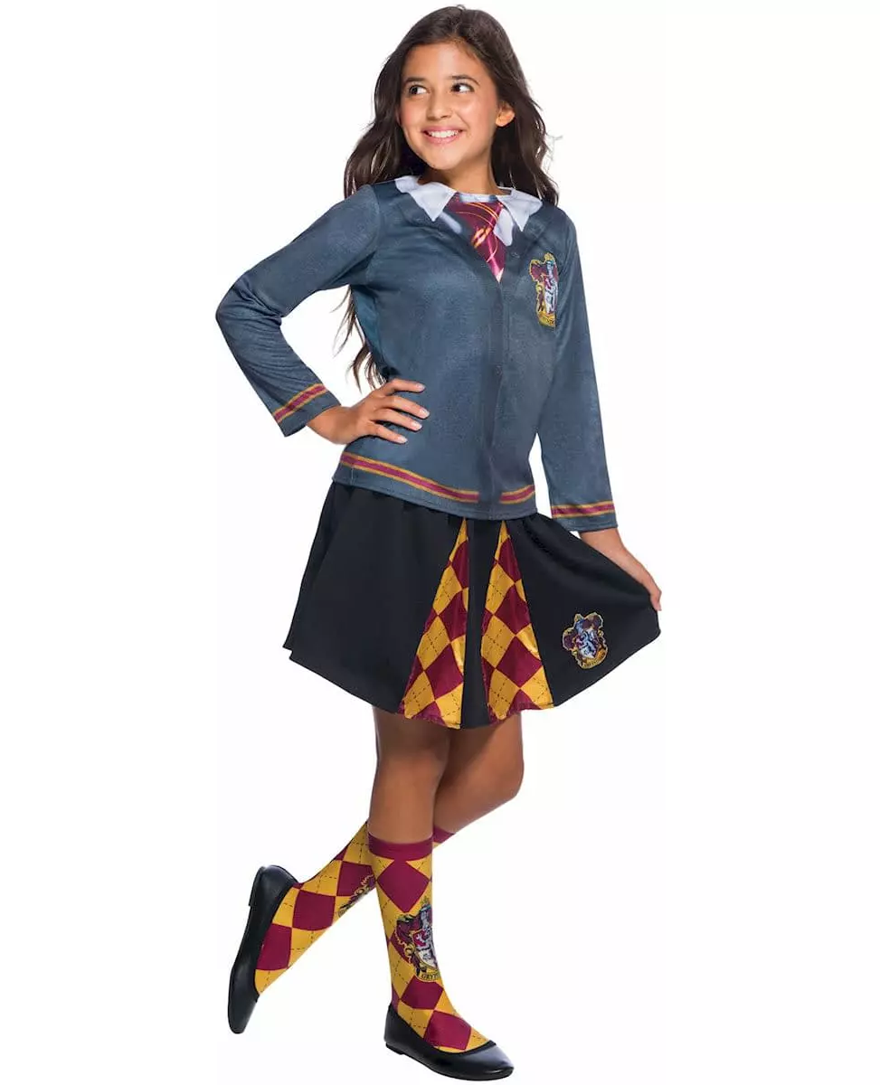 Lærlingheksa fra Galtvort, hekseskole. Dette Hermine Griffing-kostymet for jenter er offisielt lisensiert av Harry Potter. Det inkluderer en topp og et skjørt. Den langermede toppen er en imitasjon og er trykt med et grått jakkemønster med Griffing-våpenskjoldet på brystet, en blusekrage og et slips i Griffing-fargene gult og plommefarget. Det korte skjørtet er plissert. Det er svart med to folder i fargene til Griffing-brorskapet. Griffing-våpenskjoldet er også flokket på skjørtet. Dette Griffing-kostymet vil være perfekt for mange utkledningsfester som Halloween, karneval eller en Harry Potter-tema bursdagsfest. Inkludert tilbehør: Topp, skjørt, Materiale: 100 % polyesterstoff,