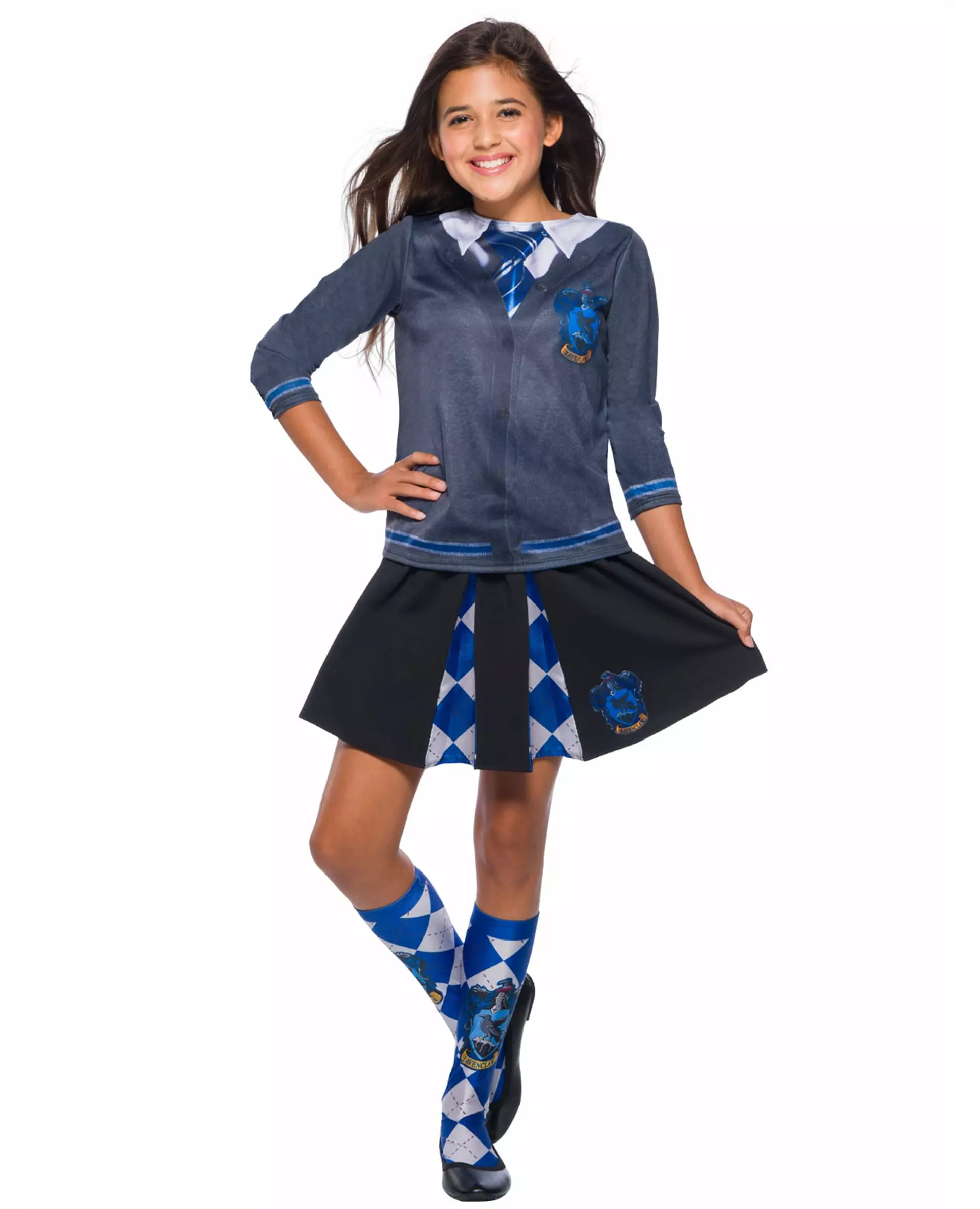 Ravnklo og du er en! Dette Ravnklo-skjørtet – offisielt lisensiert av Harry Potter – er for barn. Det korte, plisserte, svarte skjørtet har to folder i fargene til den berømte Ravnklo-skolen. Ravnklo-våpenskjoldet er også flokket på skjørtet i fargene blått og hvitt. Bring magi til trollmannsfesten eller karnevalet ditt med dette pene Ravnklo-skjørtet! Inkludert tilbehør: Skjørt Materiale: 100 % polyester Stell: Håndvask