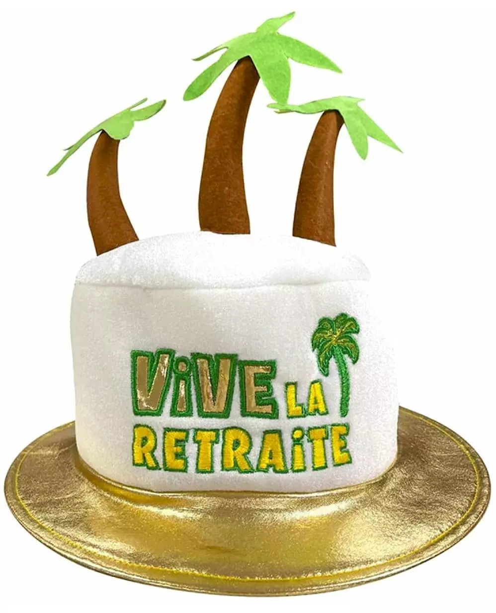 Denne hatten er for voksne. Den er formet som en øy og dekorert med tre palmer og har ordene «Lenge leve pensjonisttilværelsen». Hatten er hvit med gullkant. Dette tilbehøret er perfekt til en pensjonistfest! Materiale: 100 % polyester