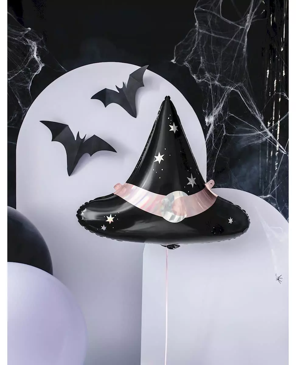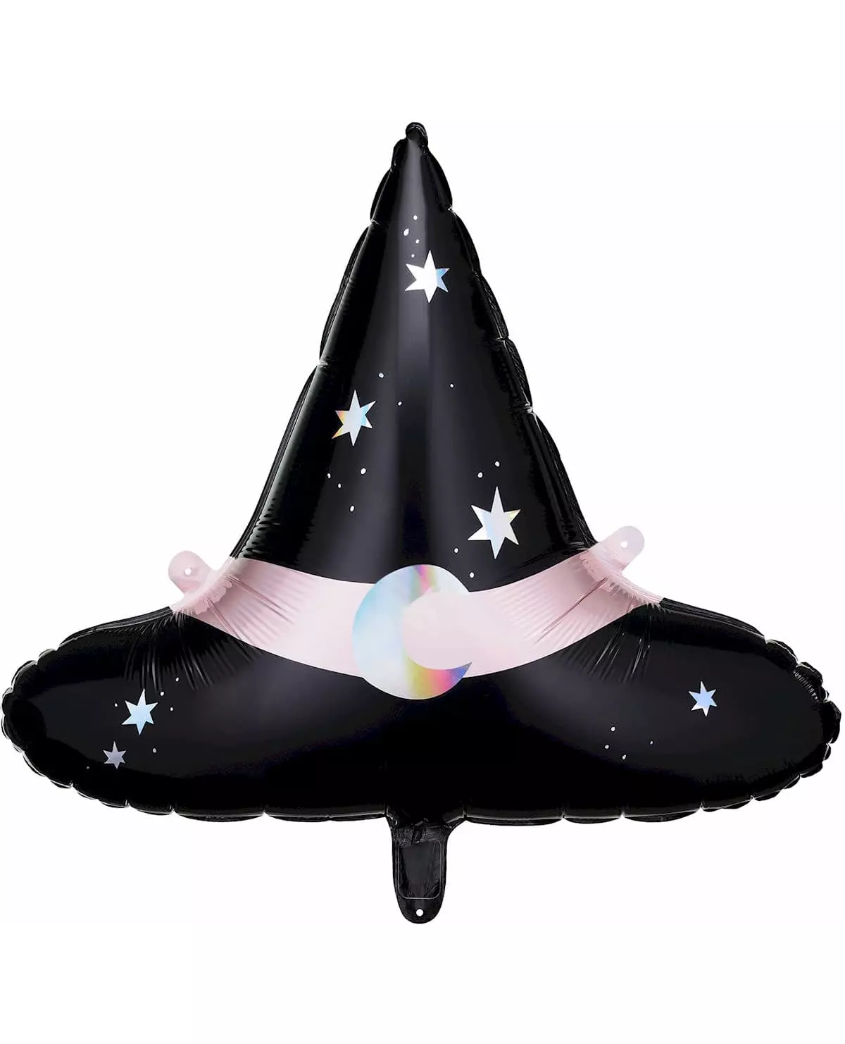En heksehatt med iriserende refleksjoner! Denne aluminiumsballongen er formet som en heksehatt. Den måler omtrent 66 x 57 cm og kan blåses opp med luft eller helium. Hatten er svart med rosa, små stjerner og en iriserende måne. Fullfør romdekorasjonen din til Halloween-kvelden med denne ballongen! Inkludert tilbehør: 1 ballong Materiale: Aluminium