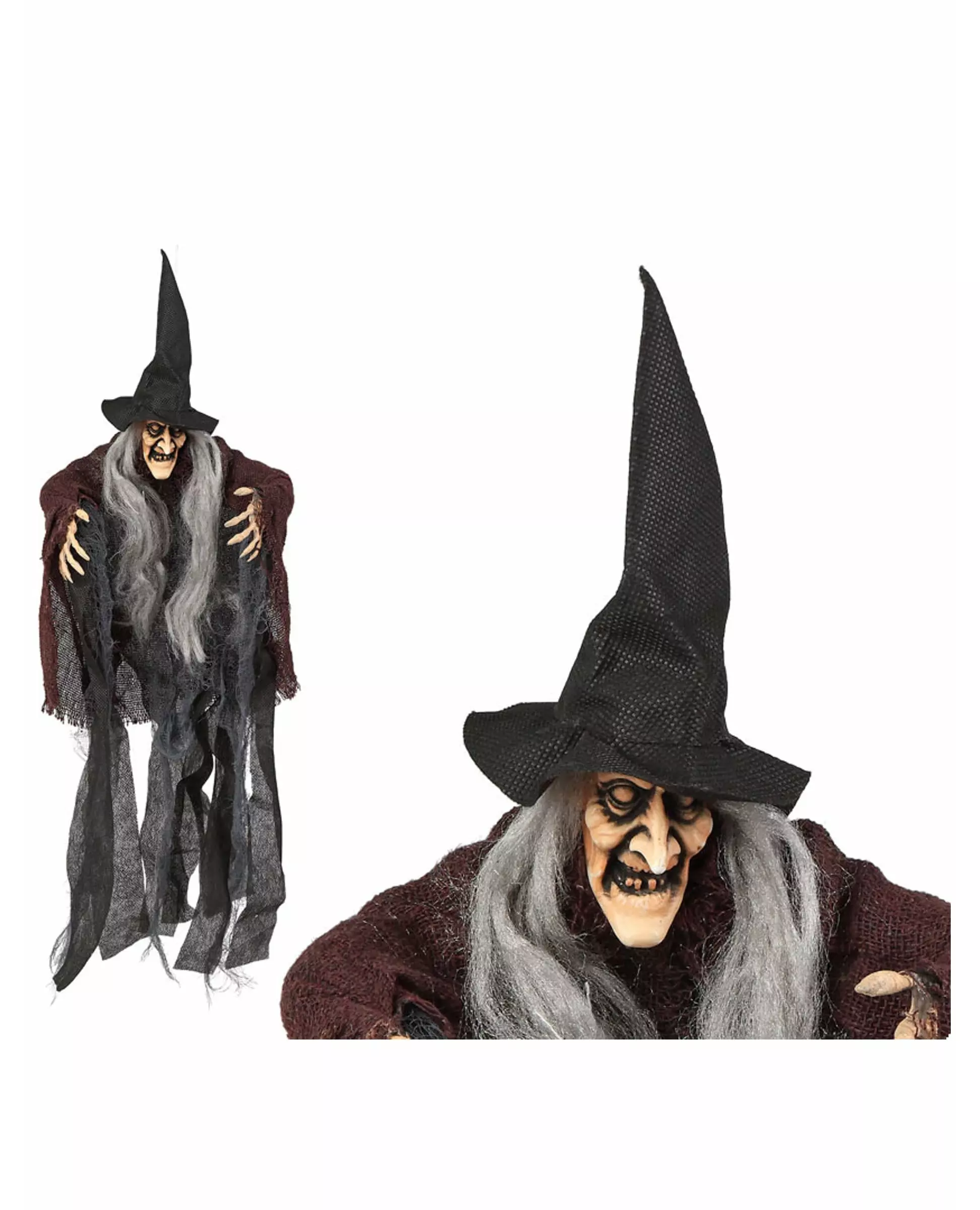 En djevelsk heks! Denne hengende dekorasjonen måler omtrent 50 cm i lengden. Den forestiller en skummel heks med en spiss svart hatt. Denne dekorasjonen vil være ideell for å dekorere interiøret eller eksteriøret ditt til Halloween!. Inkludert tilbehør: Hengende dekorasjon