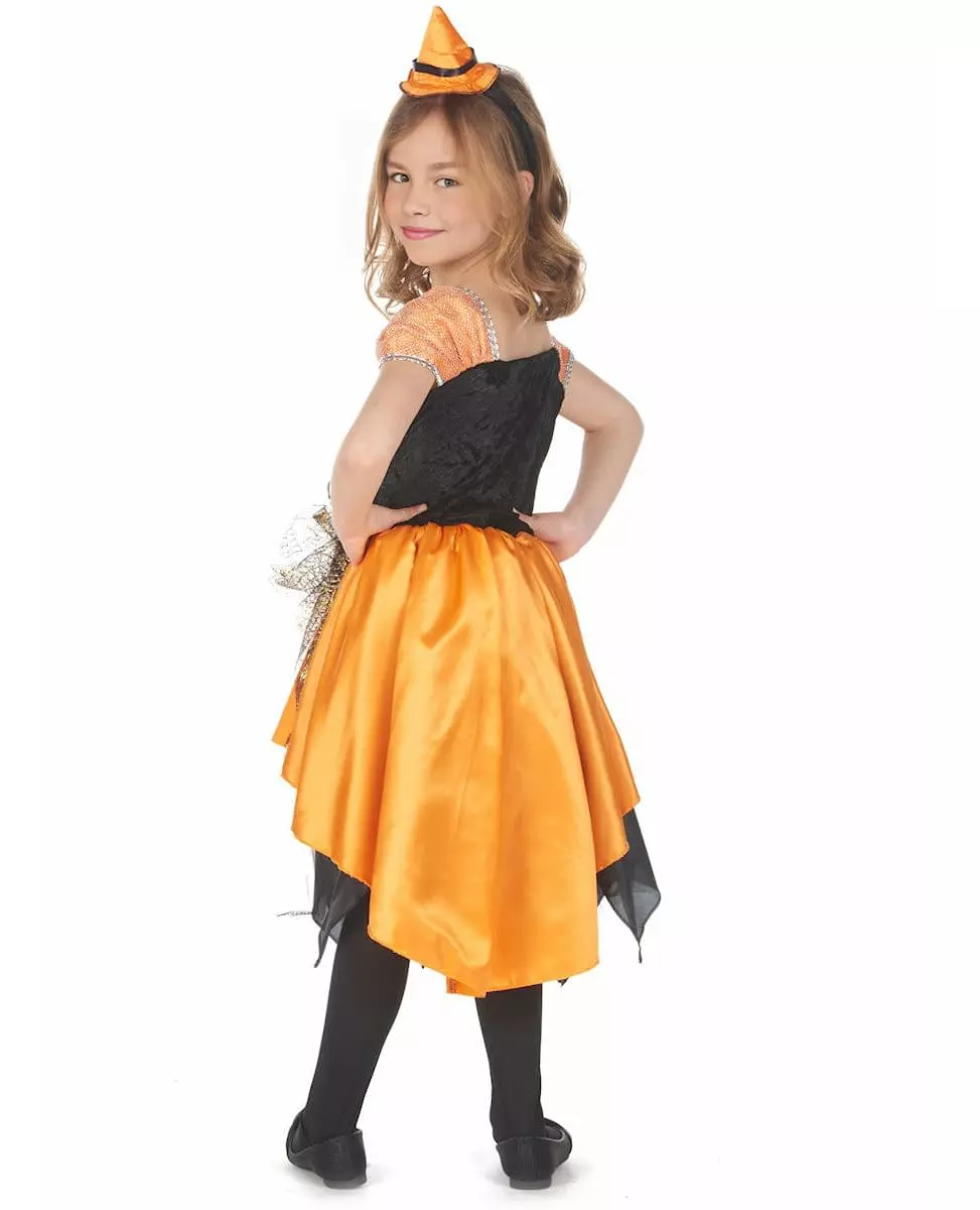 Komplett heksekostyme! Dette oransje heksekostymet er for jenter. Det består av en kjole og et pannebånd. Kjolen er oransje og svart med forskjellige rysjer, imitert ringbrynje, svart tyll og oransje og svart stoff. Bysten er oransje og svart med oransje ermer. Pannebåndet har en liten spiss heksehatt. Dette oransje heksekostymet vil være perfekt for å feire Halloween. Inkludert tilbehør: Kjole Pannebånd Materiale: 100 % polyester
